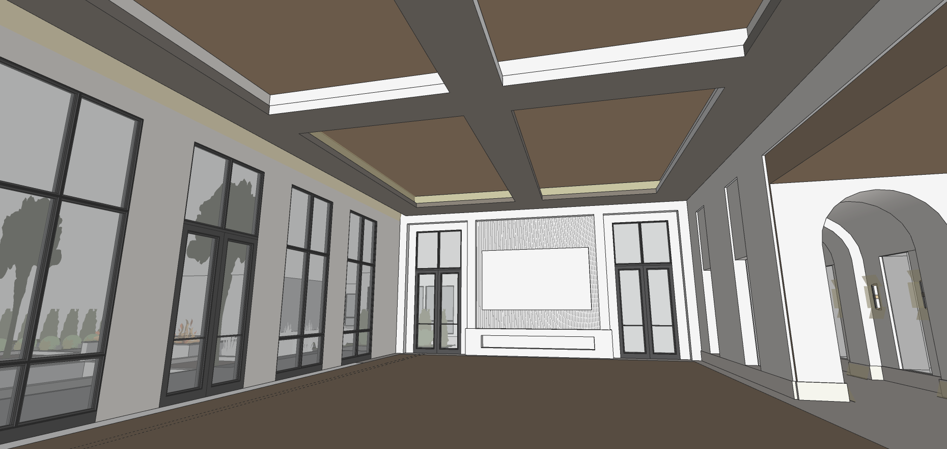 render a spacious modern interior with large floor to ceiling windows showcasing an elegant and sophisticated atmosphere the walls are a crisp white adding a sense of openness the ceiling features recessed lighting with warm soft gold tones providing a gentle glow the large rectangular panels on the ceiling are a luxurious dark brown adding depth the frames of the windows are sleek and black contrasting sharply with the light walls a subtle hint of light gray is visible on the floor enhancing the contemporary feel outside blurred silhouettes of greenery can be seen through the windows hinting at a tranquil outdoor setting the ambiance is serene and welcoming accentuated by the natural light pouring in