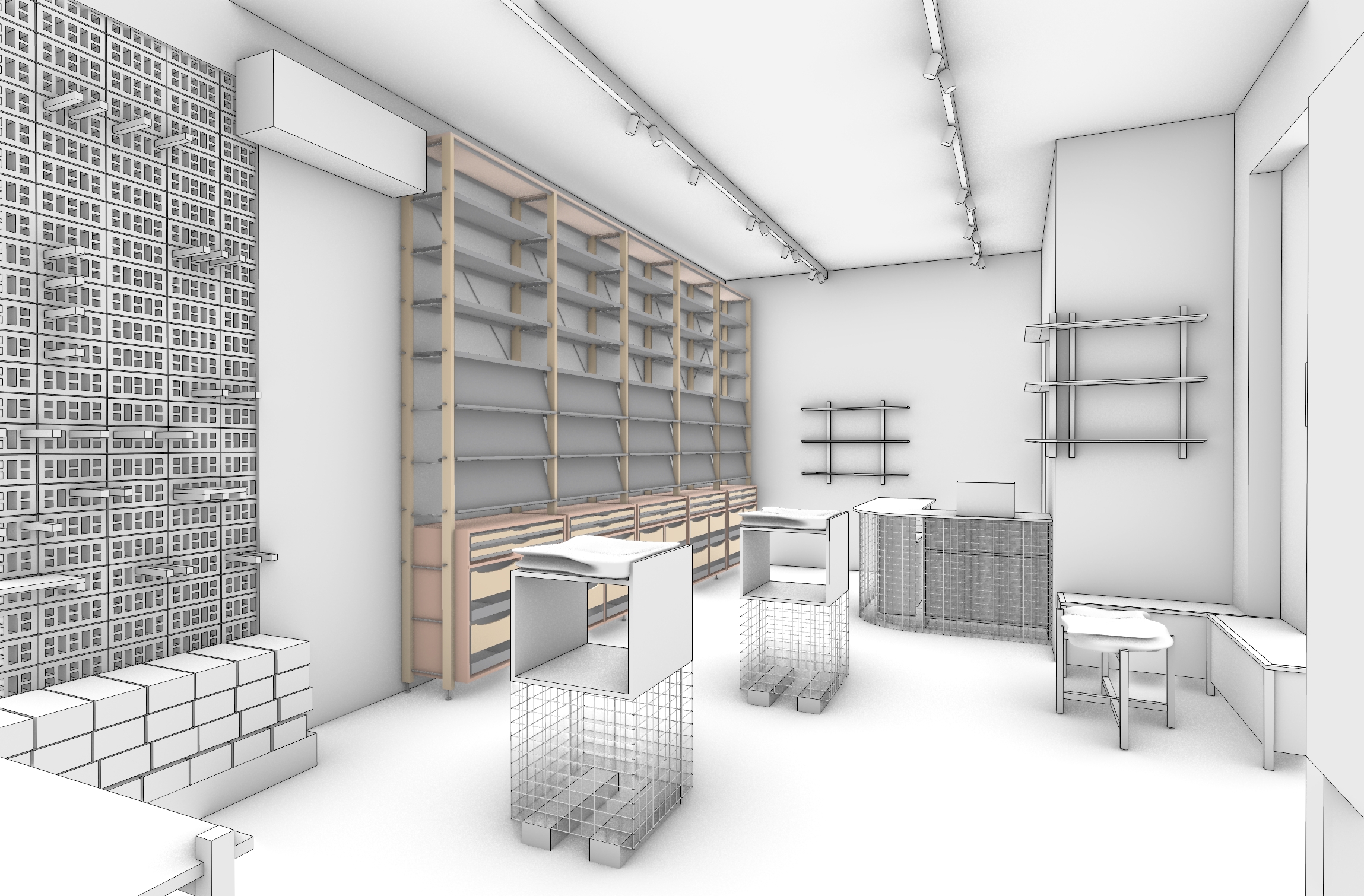 interior of a ceramics supply store and glaze showroom in cape town based on an architectural 3d model the space is a hybrid between workshop material library and retail showroom expressing the transformation of materials from raw to refined architecture layout one main wall with continuous shelving units lower section plywood drawers up to 80 cm height upper section recessed niches with slanted galvanized steel shelves shelves display glazed ceramic tile samples with different finishes vertical pegboard wall displaying pottery tools visible stacked clay bricks stored on lower shelves key elements pos counter with base gabion basket metal mesh filled with natural stones top clean plywood countertop display plinth gabion stone base open wooden shelf heavy natural stone slab top seating nook two benches made from plywood with solid ash seating surfaces coffee table with solid ash wood frame and stone slab top terracotta brick flooring nook partially separated by a terracotta brick lattice screen wall textile elements large window with semi transparent linen curtain with subtle branding linen panels above shelving units up to ceiling materials natural tactile honest light plywood solid ash wood galvanized steel slanted shelves terracotta bricks ceramic tiles and objects linen textiles natural stone slabs steel mesh gabions lighting soft natural daylight entering from window filtered through linen curtain warm track lighting highlighting glaze shelves soft shadows global illumination atmosphere calm tactile contemporary craft space not overly styled slightly raw but refined emphasis on material contrast and texture rendering style ultra realistic architectural interior rendering high detail global illumination natural materials soft shadows subtle reflections no people clean composition
