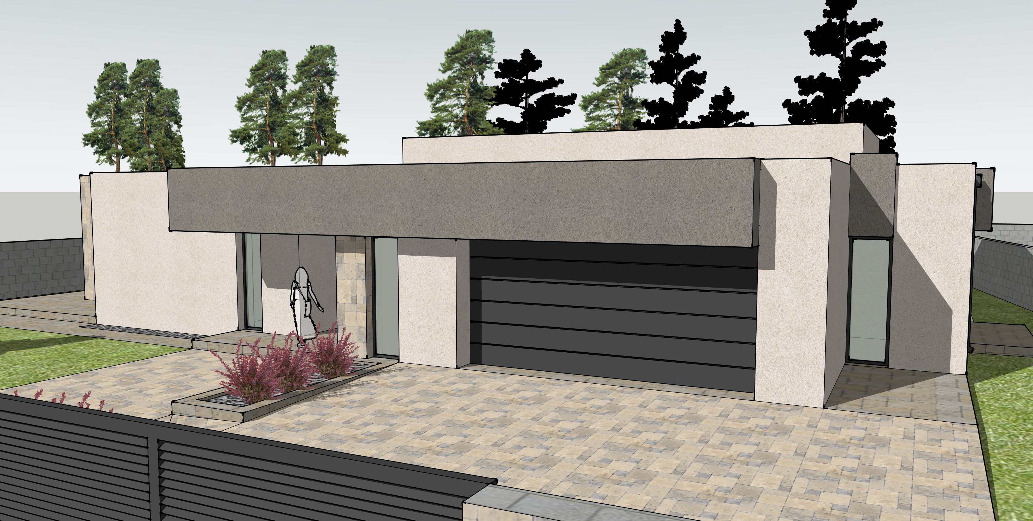 modern family house photorealistic render reflection in windows lush green pine trees in background