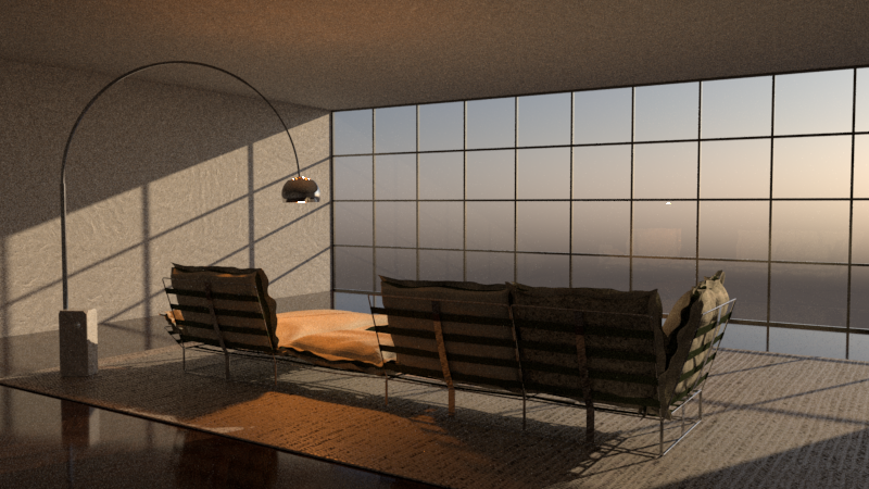 add light to the ceiling spotlights it is daytime the style of the sofa should not change you can place a folded blanket on it as decoration on the outside is a nice private garden with bushes and trees the windows have black metal frames in front of the white wall is a sideboard witch fits into the room with minimal decoration on it maybe also a small lamp on it