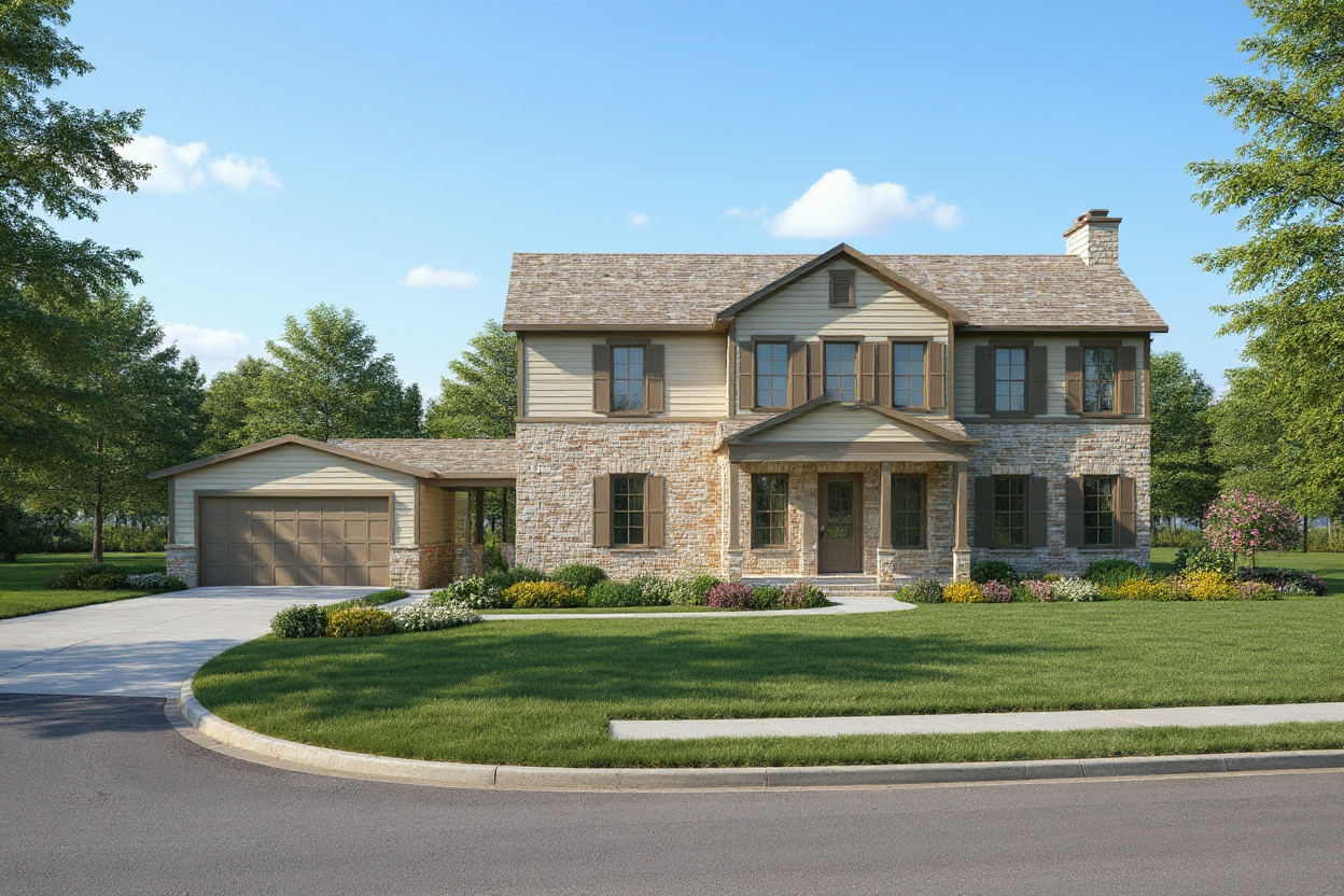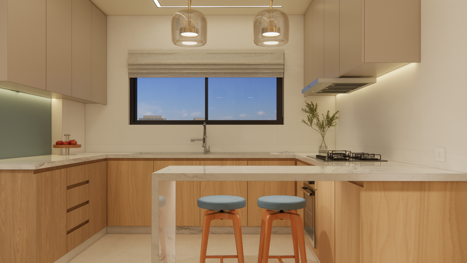 transform this 3d into a hyperrealistic photograph the environment is bright light enters through the window on the right illuminating the entire scene set the simulation to the best camera and lens equipment for this architectural style photography shot 4k quality keep the tone of the right wall the lower cabinets are made of light wood the upper cabinets are cappuccino colored the lower cabinets are light wood blue sky with some clouds