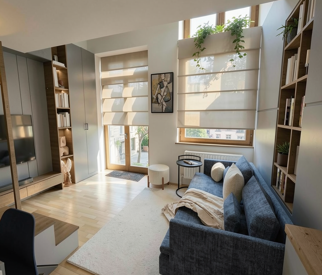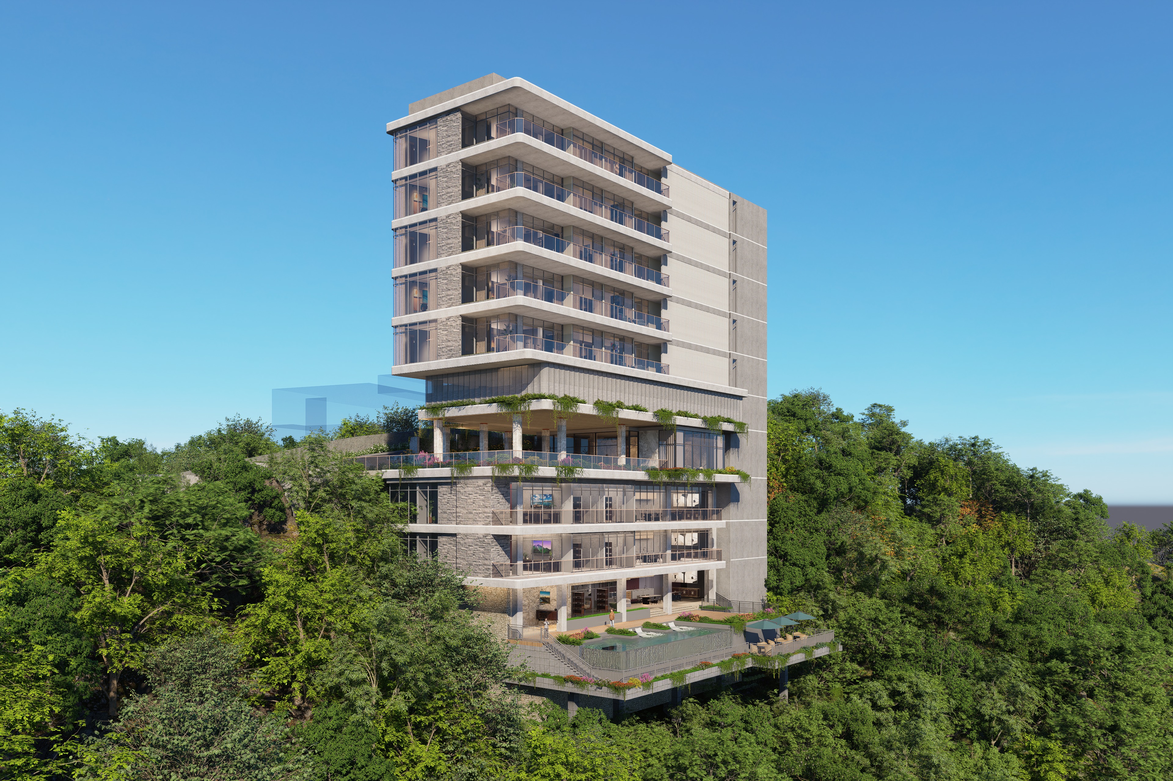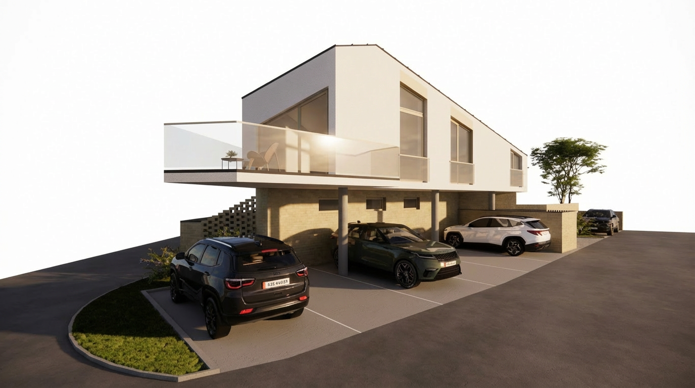 modernist exterior shot please make an architectural render of this image do not change the perspective and aspect ratio make the setting on a mountain with a subtle sunrise scene and add a subtle misty horizon please make the mountains shorter and a more vegetation please add a hint of sunrise architecture