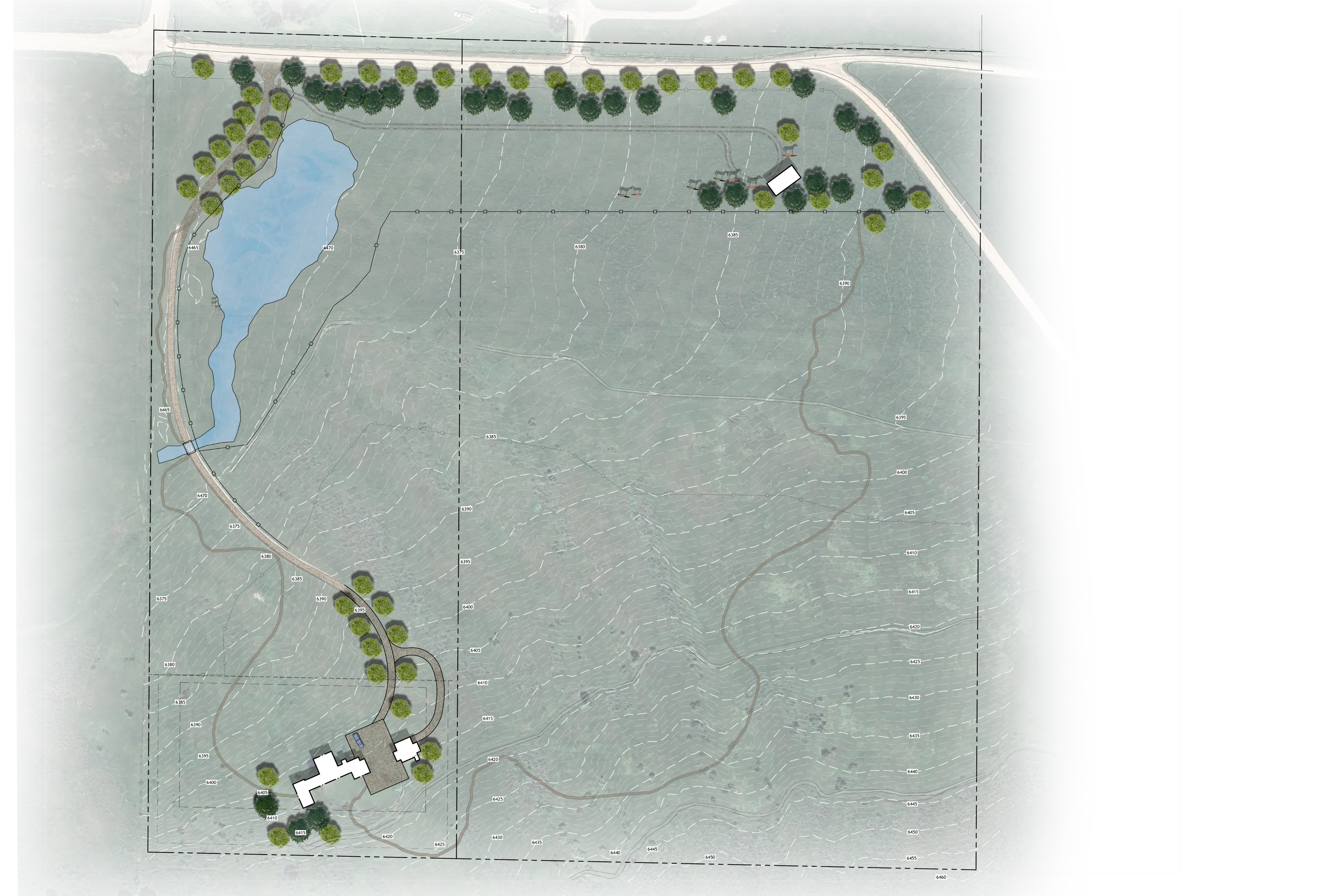 this is a 2d overhead plan view site plan add some realistic touches to the tree symbols make the shadows more detailed keep it very simple and do not add anything that is not on the plan there is only one pond which is closest to the top left of the image the space between the structures at the end of the driveway is an autocourt