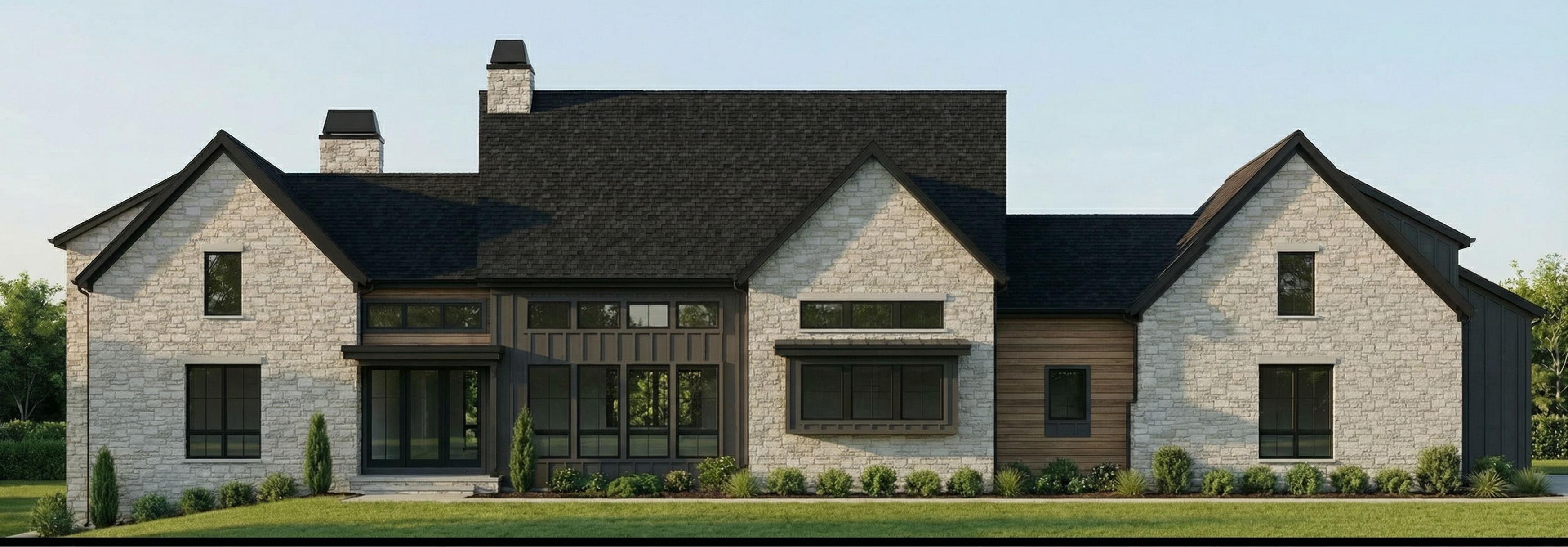 using the provided architectural drawing create a professional photorealistic architectural rendering keeping all of the architecture and details exactly the same applying the following materials and colors roof wood shake roof shingles shingle walls use nucedar shingle siding in the color argos trim a warm white color windows a warm white color stone base a random rubble pattern with a mixture of grays and browns add trees to the background make the chimney caps a dark bronze color and make the metal roof accents a dark bronze metal color white garage doors tall background trees on the left and right sides with the middle open to the sky