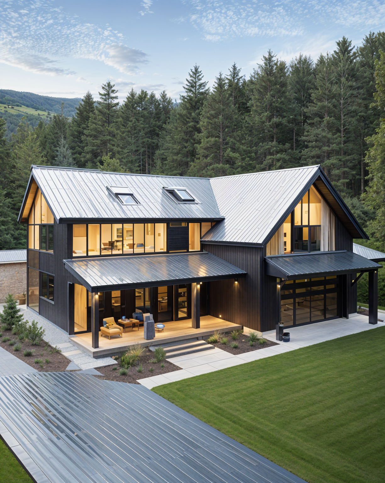 please make it a nice sunny day put this house on an acreage with a long driveway add an ocean background add surrounding trees including a cherry tree in bloom add nice minimal landscaping around the house but especially in the flower beds in the front you can include trees behind the house too make sure to use the same materials and colors as the provided photo make realistic