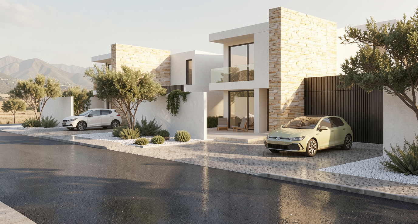 use the provided image as strict base reference preserve the original architecture composition camera position framing proportions and scene layout exactly as they are do not redesign reinterpret or add remove elements objective enhance the image to achieve a high end architectural editorial look refined poetic visually rich and photorealistic without altering the original design materials textures refinement improve realism of all materials stone plaster metal glass pavement add subtle micro texture and natural imperfections introduce slight tonal variation to avoid flat or repetitive surfaces maintain material authenticity no stylization no exaggeration avoid overly sharp noisy or artificial textures light atmosphere strict control preserve the original light direction and logic exactly do not change sun position or shadow orientation refine lighting to be more natural and photographic softer highlights balanced contrast gentle shadow transitions introduce a subtle atmospheric depth very light haze if needed avoid dramatic cinematic or artificial lighting effects reflections surfaces make reflections more physically accurate and slightly softer avoid mirror like or overly perfect reflections ensure correct roughness on all materials color grading apply a subtle editorial color grading slight desaturation for realism maintain a natural warm mediterranean tone if applicable avoid hdr look or excessive contrast vegetation context slightly reduce artificial appearance of vegetation add natural variation in tones and density keep everything controlled and not overgrown overall style architectural digest high end european editorial photography clean calm intentional composition poetic but restrained photorealistic not cgi looking critical constraints very important no change in architecture no change in composition no change in camera or framing no change in proportions no change in layout no added or removed elements no change in light direction no exaggerated textures no dramatic effects