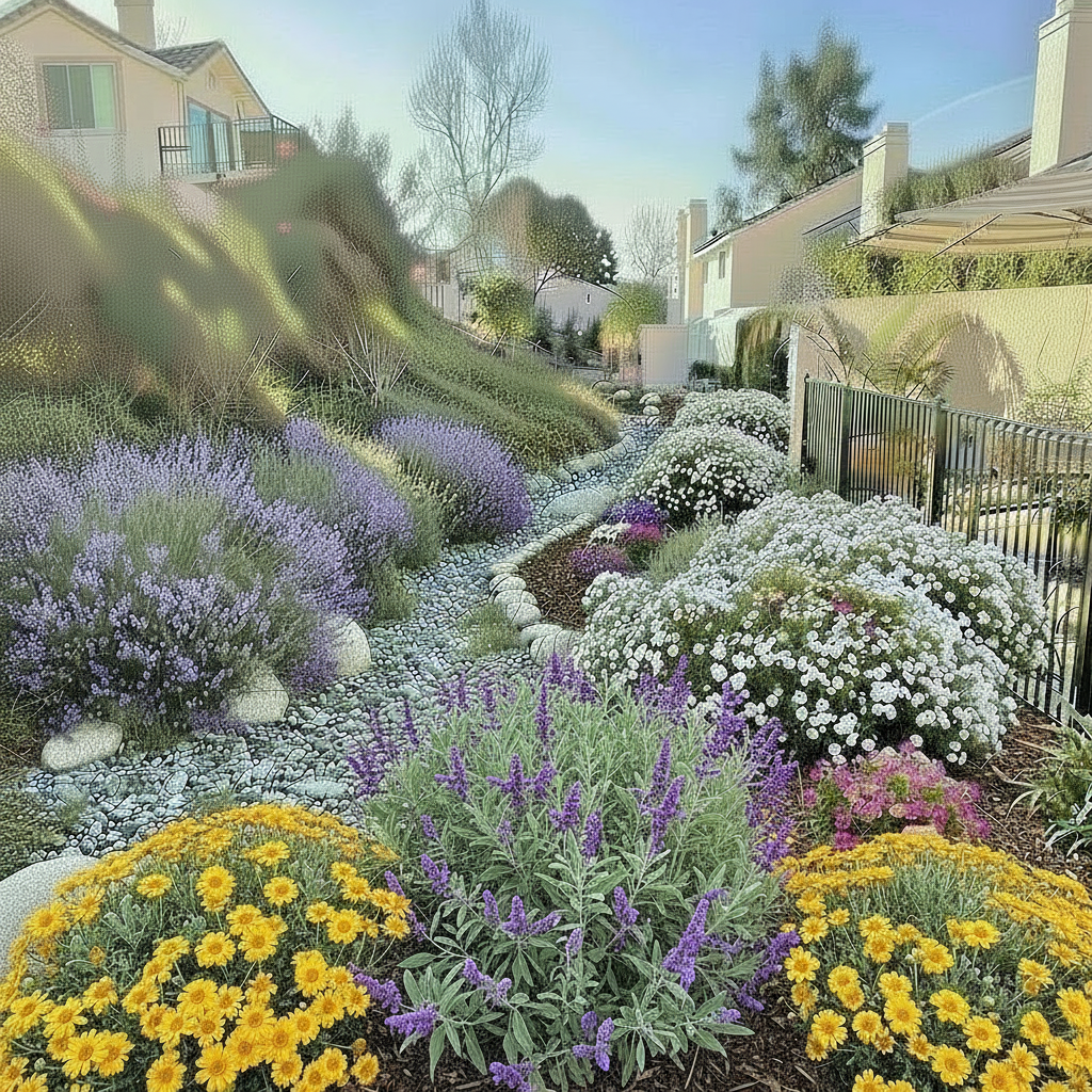 add more yellow shrubs like the one in the foreground across from the purple shrubs