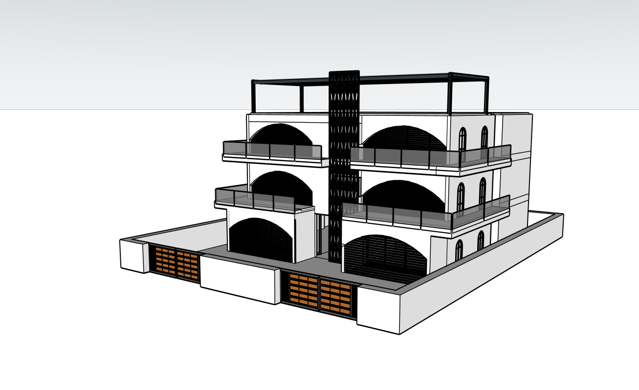 use the sketchup screenshot as a loose reference for general scale and footprint but reimagine the building as a luxurious 3 floor apartment complex in djibouti elevate the massing with elegant volumetric shifts terraces and refined proportions design the facade using high end materials like natural stone travertine smooth stucco and bronze or black metal accents feature large floor to ceiling windows shaded private balconies vertical fins or louvers for sun control and lush rooftop or terrace greenery the balconies have glass railings as well as shadded louvers on the arched openings that are on the top two floors highlight landscaped entrance areas ambient pathway lighting and modern exterior furniture the environment should include palm trees tropical plants and clean urban pavement realistic midday lighting with sharp shadows soft reflections on glass and a warm elegant ambiance ultra detailed cinematic realism with high fidelity and rich architectural textures set the scene on late afternoon with sharp shadows adding light fixtures to the building enhancing material richness the surrounding context should show neighboring houses in close proximity reflecting typical djiboutian architecture flat roofs textured facades and small scale local character include tropical landscaping palm trees climbing plants and stone paving for a lush high end feel realistic photo grade render with cinematic atmosphere and no visible post processing artifacts