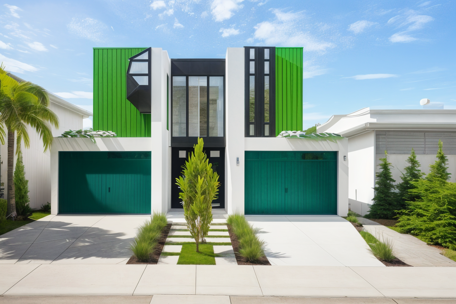 exterior shot modern architectural design of 2 duplex townhouses with cylindrical brick walls and white battens the fa ade features smooth white brick and light white battens lush greenery spills over the walls with vibrant green plants and trees including palm and evergreen trees creating a fresh and natural atmosphere the driveway is made of travertine coloured crazy pavers with a neutral sandy tone the sky is a soft pastel blue giving a calm and serene ambiance architecture