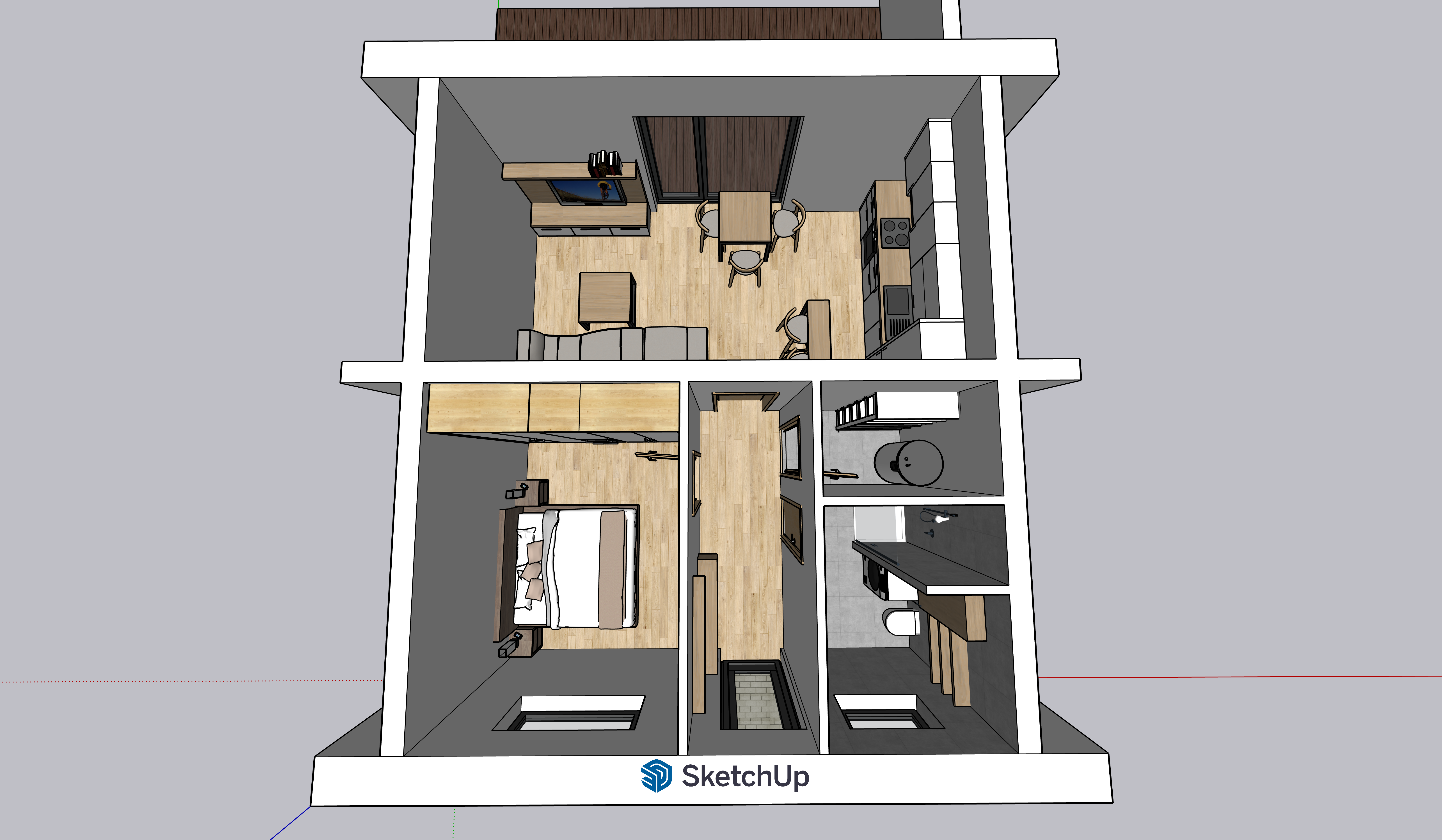 translate the concept from the image into a photorealistic top view of the apartment layout strictly adhering to the image format viewing angle placement and shape of individual elements especially the placement of doors the living room has a light oak wooden floor a modern grey sofa an elegant wooden coffee table and a minimalist tv unit with drawers with white doors drawer fronts and a shelf above the tv there is a large french window between the sofa area and the kitchen the dining area has a light square wooden dining table with matching chairs a bar counter and a kitchen with white doors and a wooden worktop with a black hob and sink the hallway has a light oak wooden floor and a storage wardrobe block right next to the entrance door the doors to all rooms lead from the hallway show them as open next to the kitchen is a utility room which has elegant dark grey tiles and contains a shelf for storing various household items and a boiler opposite the door to the utility room is the door to the bedroom which has a cozy bed with pillows and blankets in spring colors a light oak wardrobe with white doors and a light oak wooden floor the bathroom has elegant dark gray tiles opposite the door from the hallway is a shower next to it towards the window is a washing machine and above it is a cabinet with white doors and next to it in the corner of the room is a toilet with 2 shelves opposite the washing machine and toilet is a double sink use natural and warm lighting to create a cozy and pleasant atmosphere
