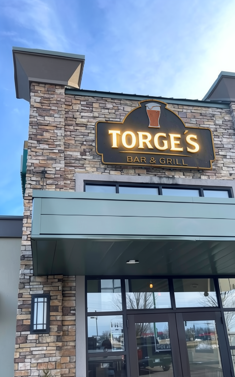 change absolitely nothing about this sign keep all finishes lighting dimensions the same remove the top arch and beer glass on the sign and make it rectangular with only the text and a straigh top with no jogs
