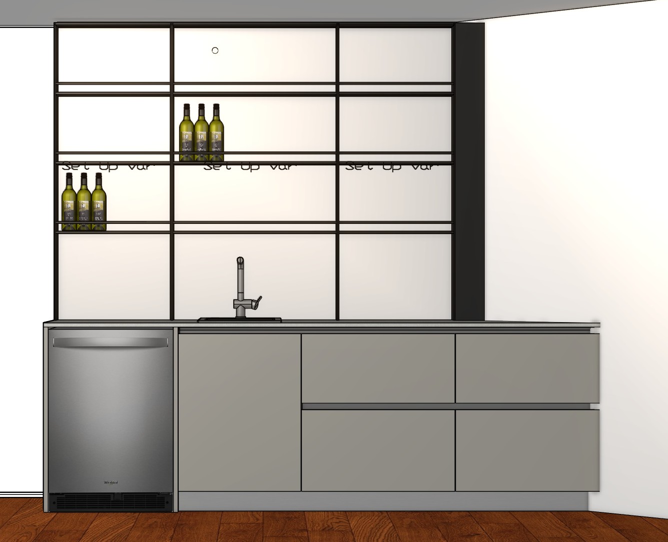 small dot above is a sprinkler tall black metal shelving without light floors red oak