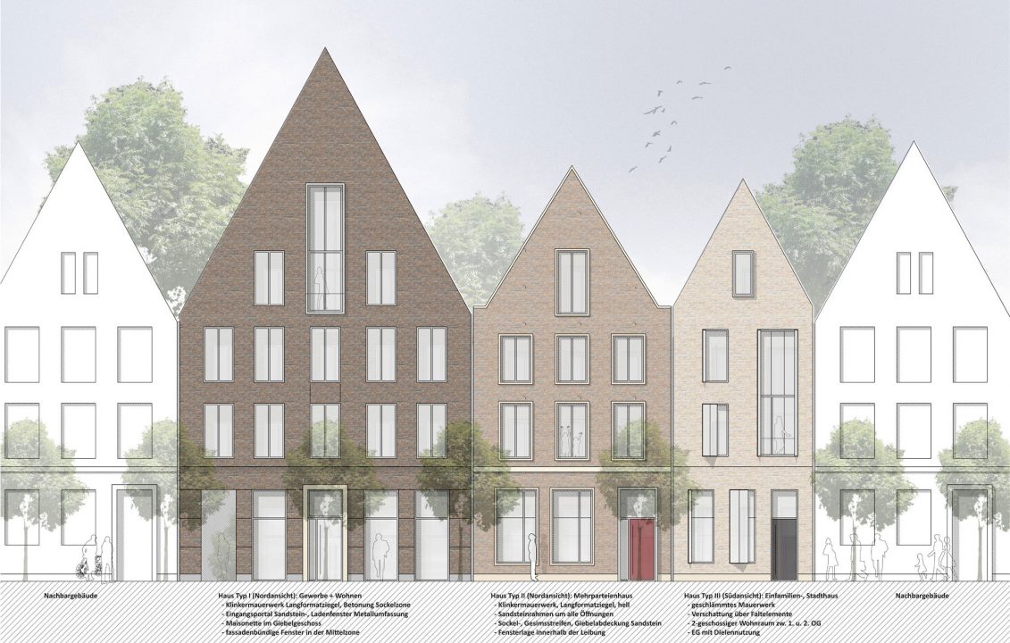 exterior shot use image 1 as the exact geometry reference the left and right gabled buildings shall use the facade design materials and proportions from image 2 with traditional european clinker brick facades in warm red brown and sand tones subtle mortar joints fine grain brick texture vertically oriented narrow windows with light colored frames and a contemporary interpretation of historic brick architecture the middle flat roof building shall have a smooth mineral plaster facade in light beige or light warm grey with a slightly rough fine grain stucco texture and a matte finish clearly contrasting with the brick buildings while remaining architecturally harmonious the rendering shall be photorealistic with soft daylight a neutral overcast sky high material realism clean architectural visualization style and no added elements beyond facade materials and surface textures