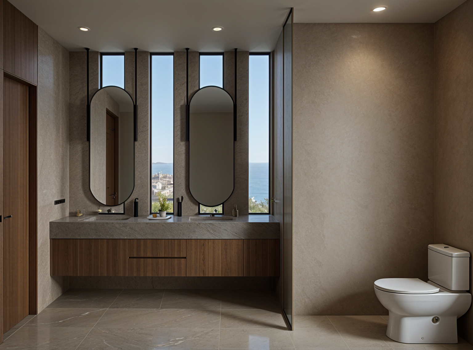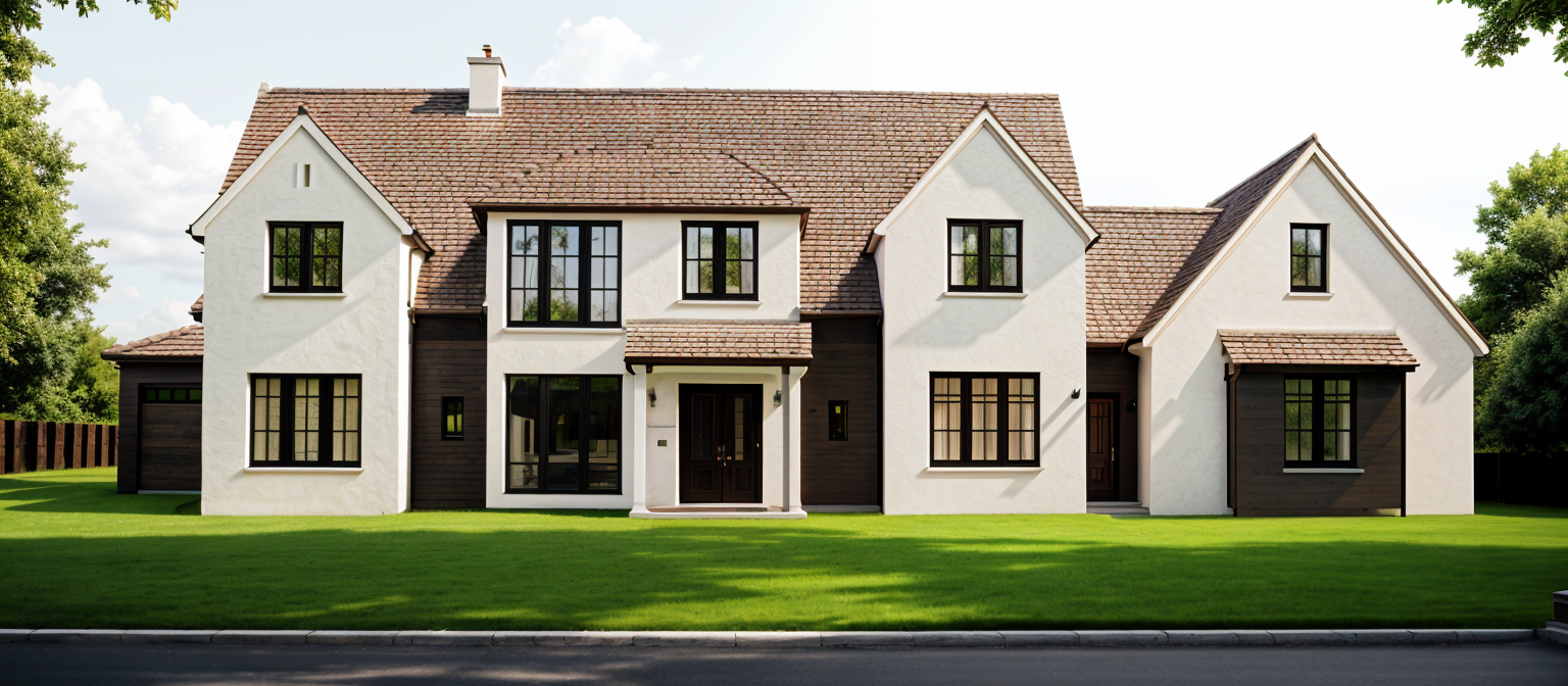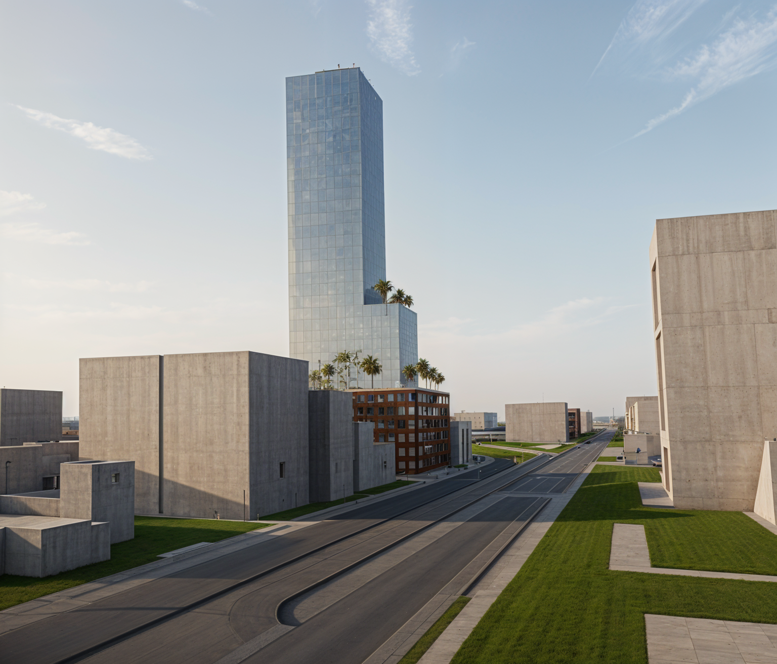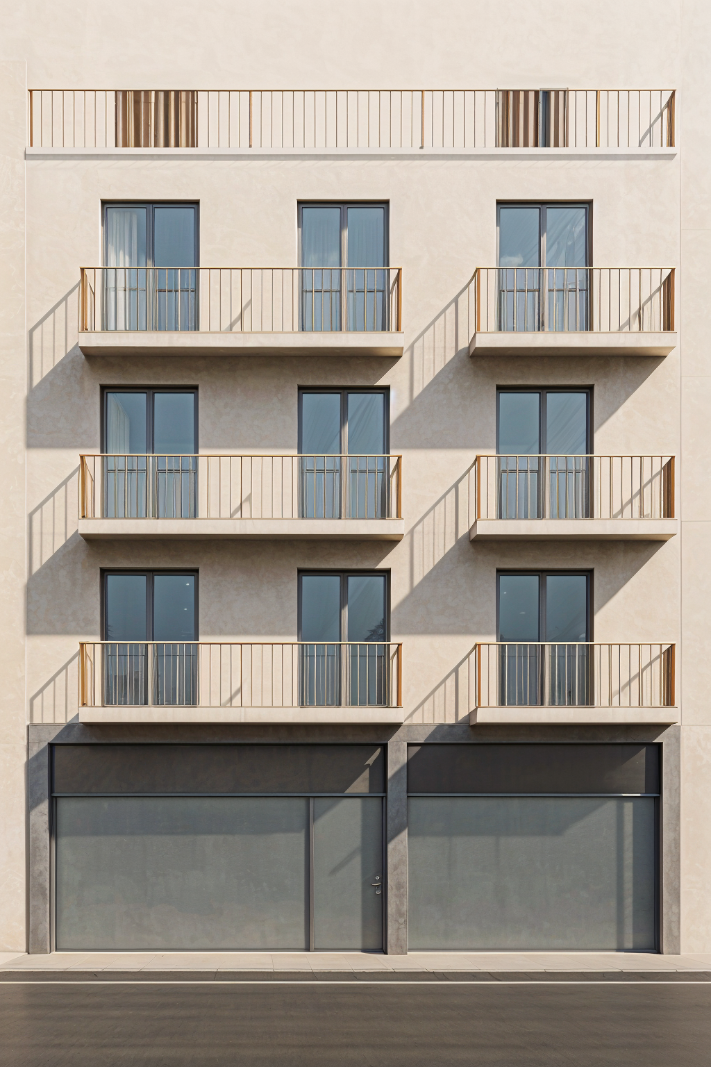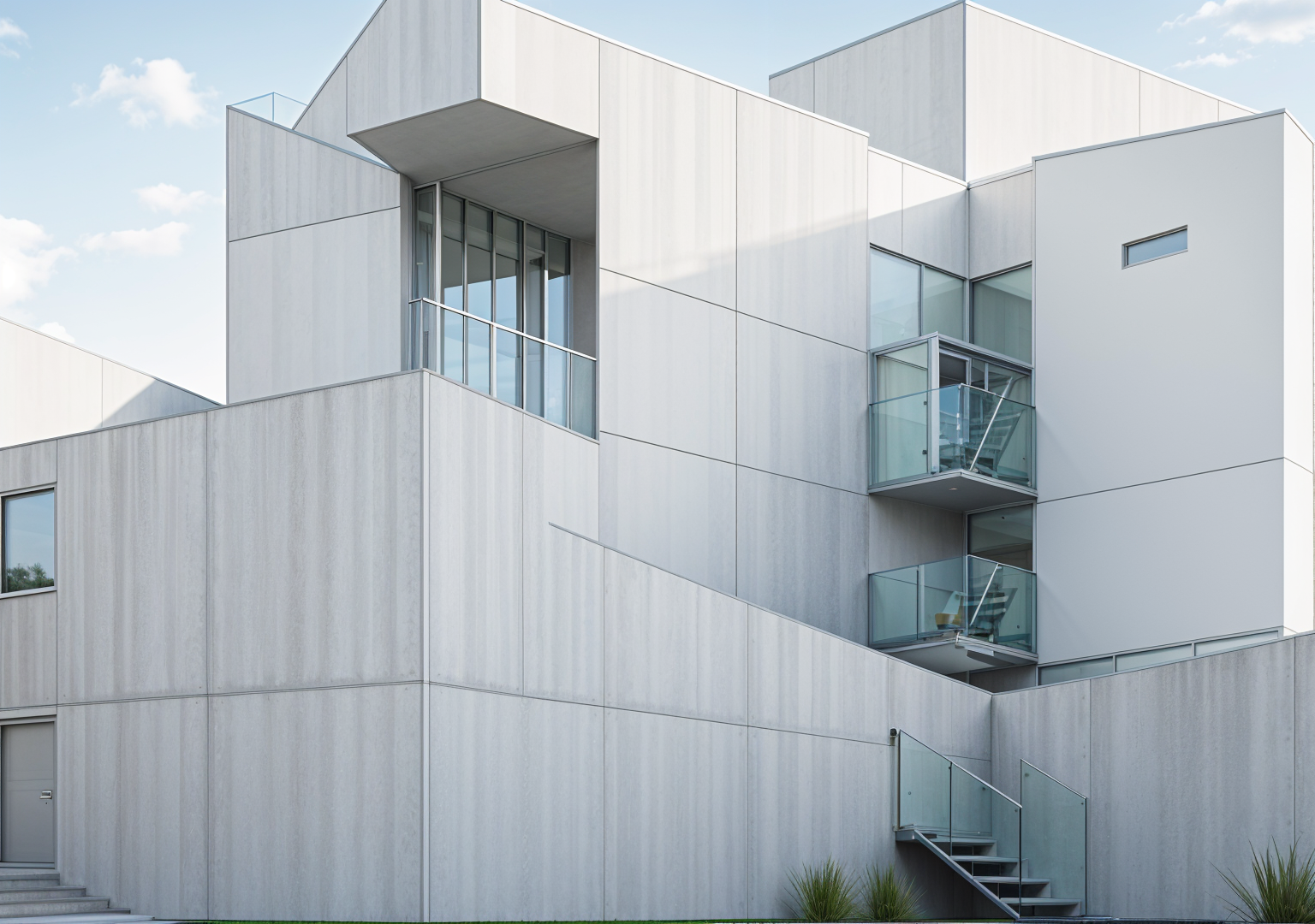 a modern architectural structure with large minimalist walls and expansive glass windows the primary color of the walls is a clean soft white the windows are tinted with a subtle blue hue reflecting a clear sky the fire escape stairs are crafted from sleek dark grey metal the atmosphere is tranquil and contemporary with soft natural light casting gentle shadows the overall scene conveys a sense of modern elegance and simplicity architecture