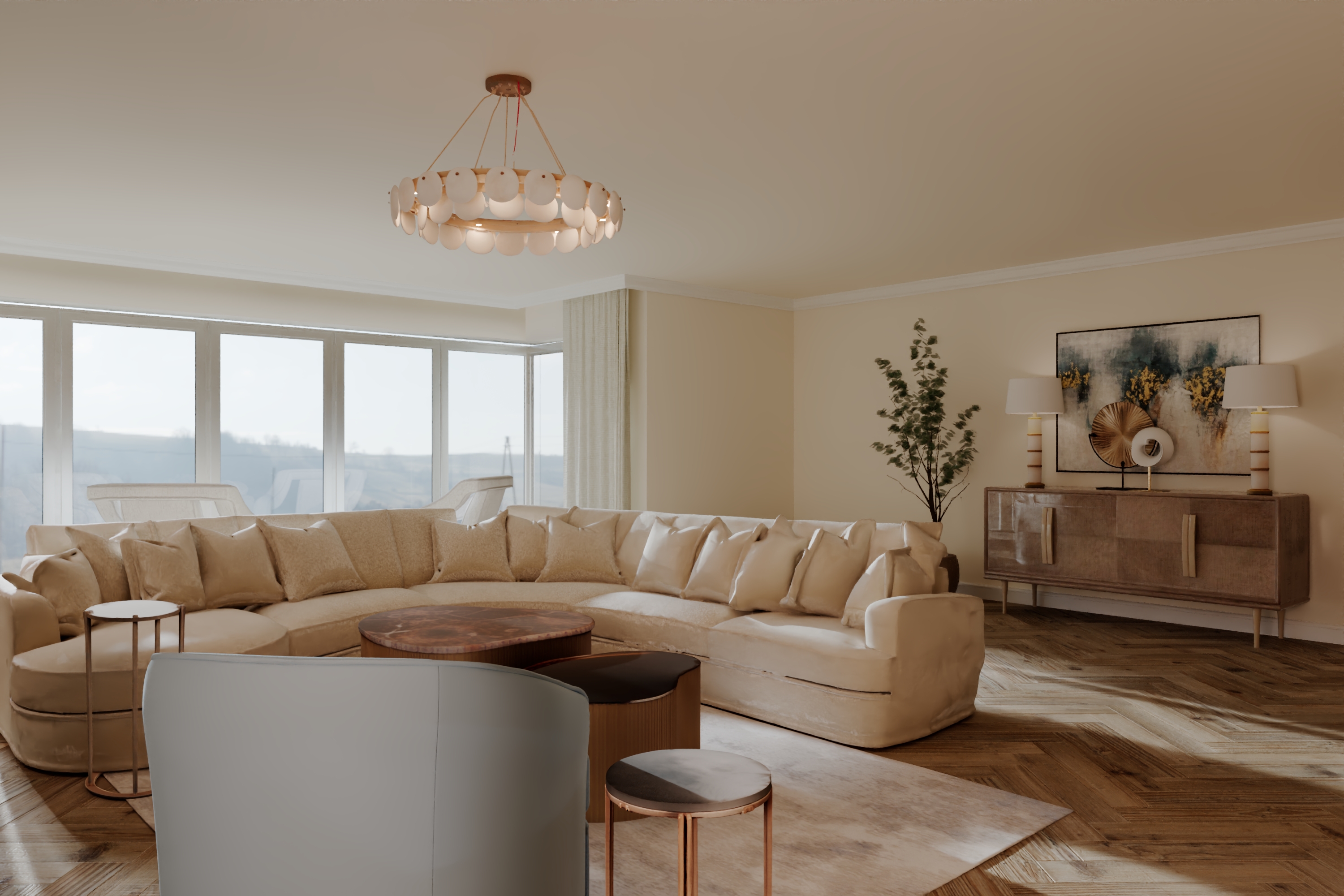 change the armchair to mid blue fabric the sofa is light beige velvet the back wall is divided into 3 panels