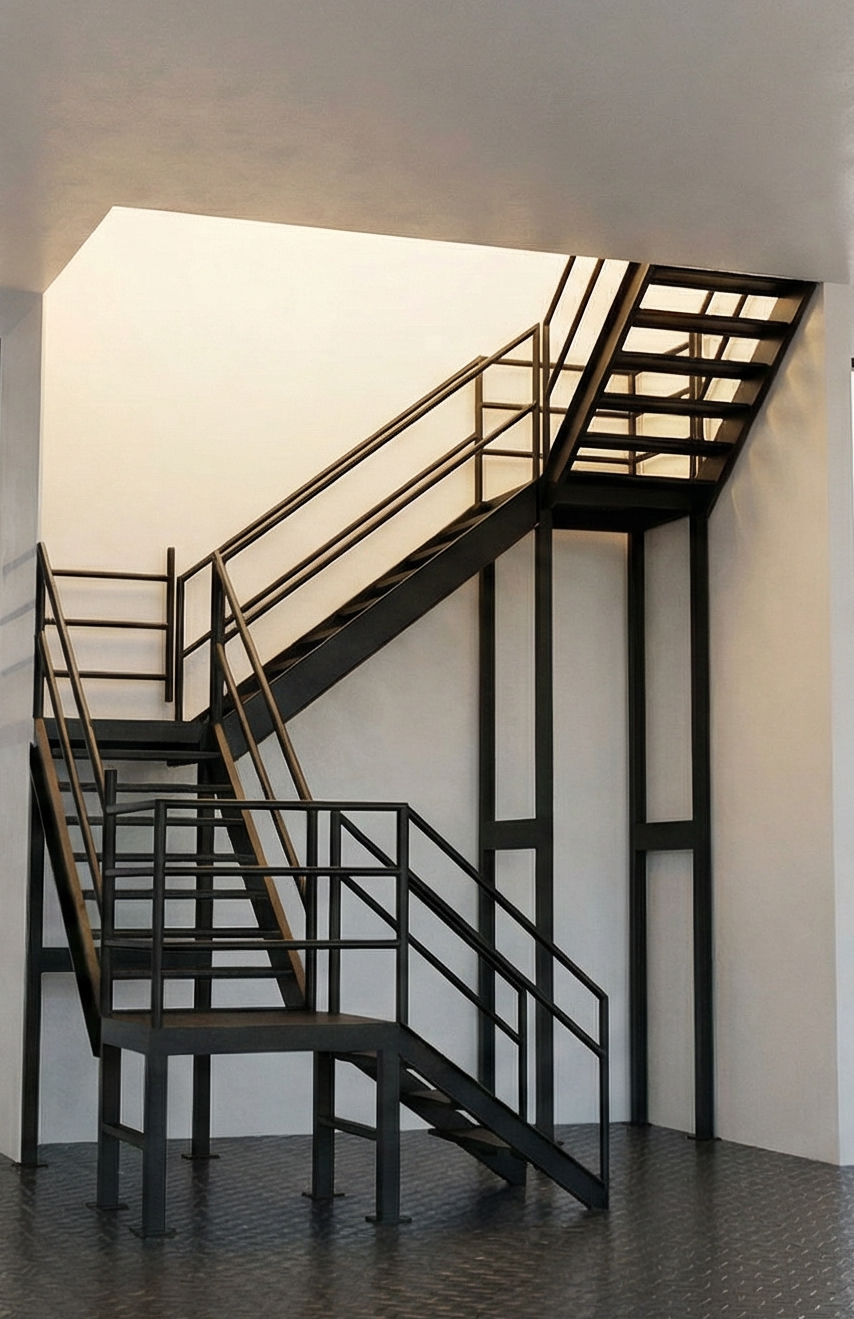 steel staircase black black metal steps change railing to vertical sticks on every step light from above concerete tiles floor