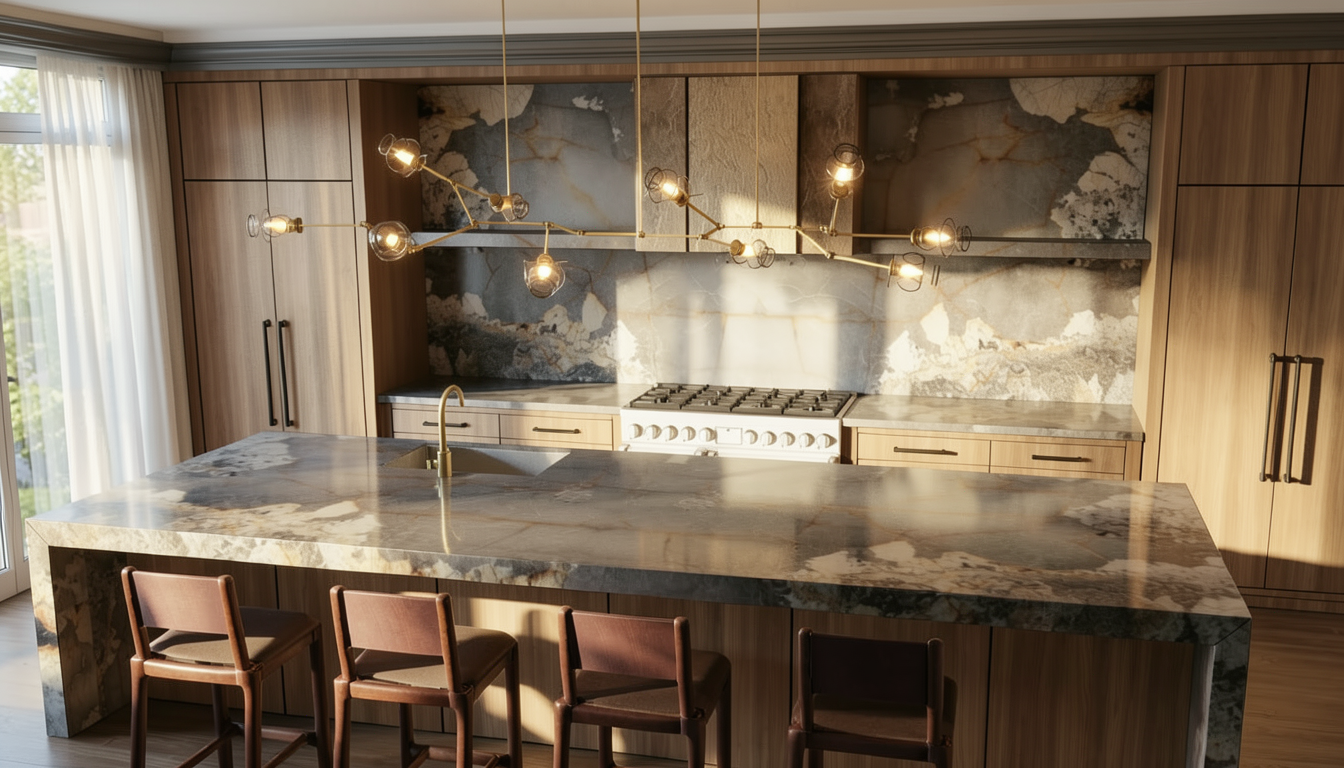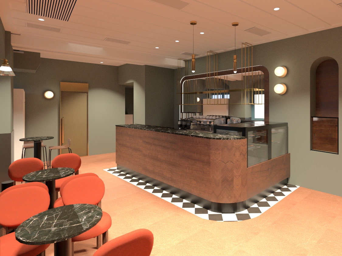 transform the provided coffe bar interior image into a high end photorealistic render with warm golden hour atmosphere soft glowing highlights and relaxed upscale coastal energy while keeping everything exactly the same same proportions same bar shape same booth seating same ceiling curves same wall finishes same yellow curtains same materials and same spatial configuration do not move or alter any objects geometry textures colors or furniture positions the chairs throughout the restaurant must remain exactly in the same locations and proportions but their materials should read realistically chairs should appear upholstered in soft reddish teracotta fabric with subtle natural tone but upholstere with a matte plush surface and gentle directional nap while keeping their shapes frames and positions unchanged add premium table settings including coffee glass and a cake on plate while keeping all tables and chairs in their exact positions include modern young guests seated at the bar and at selected tables casually social correctly scaled tastefully integrated without crowding or obstructing architectural details add two bartenders behind the bar preparing drinks and interacting naturally while preserving the bar s structure and alignment the display counter must clearly appear filled with cake and sweet with cool reflections moisture and texture while keeping its exact position and shape unchanged on the bar shelves add wine bottles and premium alcohol bottles arranged tastefully and evenly while keeping the shelving structure unchanged the shelving should feature warm and bright accent lighting enhancing reflections and bottle silhouettes the wall behind the bar shelves must clearly appear as amber glass in a deeper richer golden amber tone with a ribbed textured surface and illuminated from behind with warm vivid backlighting while maintaining its exact geometry proportions framing and alignment lighting should emphasize golden hour warmth gentle reflections soft shadows enhanced color richness and luxurious catalog level realism improve depth and realism through wood grain richness marble shine brass highlights fabric texture and polished clarity while keeping the entire scene exactly as originally designed