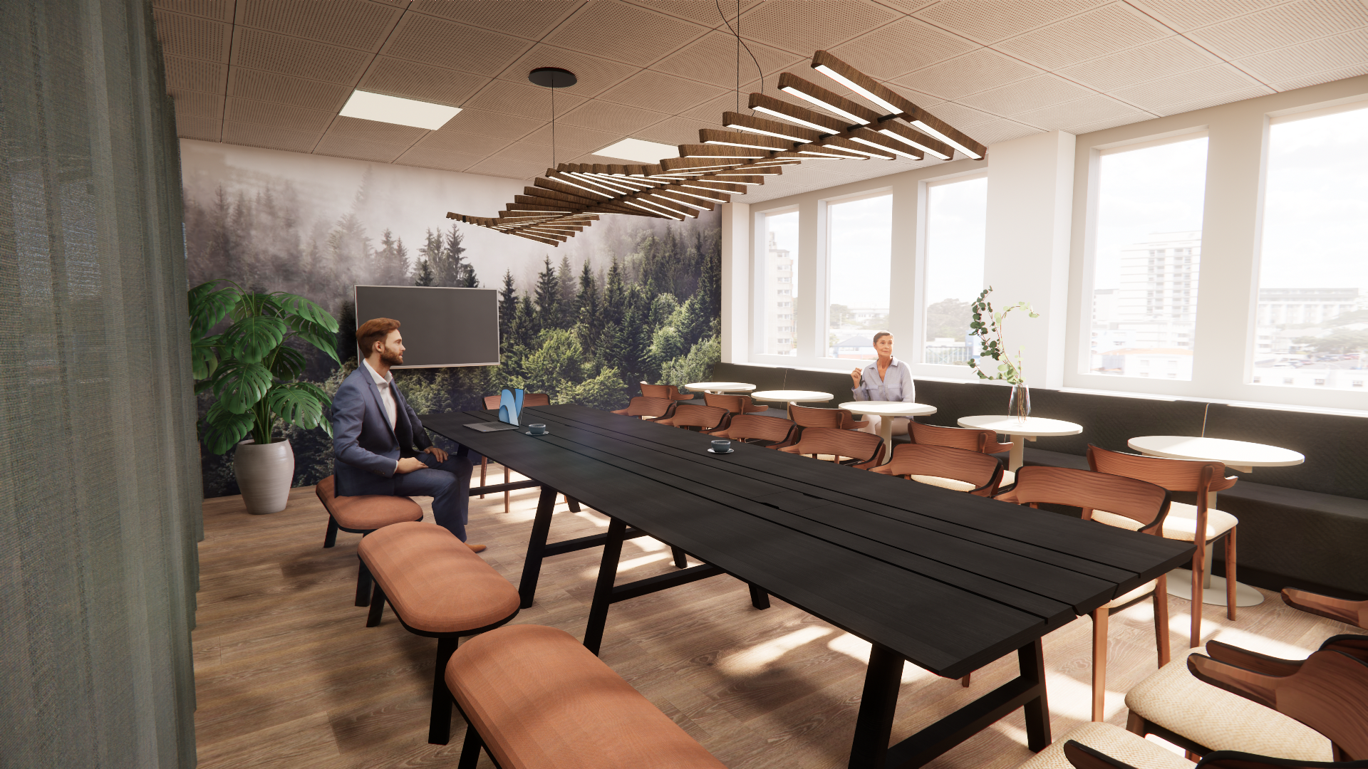 create a serene office meeting room scene featuring large windows with a city view the ceiling is fitted with modern wood toned pendant lights the long conference table is matte black with beige cushioned chairs on the table are minimalist ceramic mugs colored white near the wall is a realistic potted plant with lush green leaves the atmosphere is calm and professional enhanced by warm wood flooring