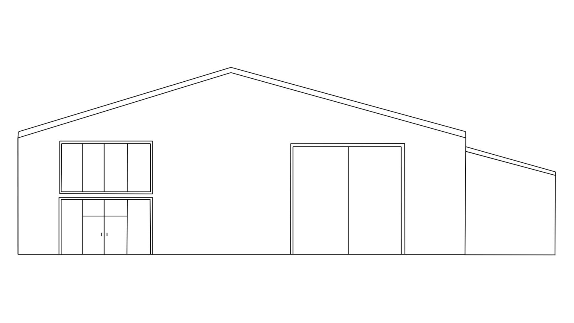 please create a realistic rendering of the front facade of the production hall using only the provided orthogonal projections of the front facade please maintain the exact proportions of the building and the roof geometry a gently sloping gable roof with a white finish the exterior walls should be clad in black siding on the left side there is a double leaf entrance door with a glass panel and next to the door one window on the right side there is a double leaf gate in anthracite but the gate frame must be white the lower part of the hall should be white please do not change the placement of doors windows or the facade layout everything must match the drawing the camera should be at eye level focal length 35 45 mm natural daylight soft shadows neutral uniform background semi realistic architectural visualization style clean and minimalist scene no surrounding elements ambra polska logo in white