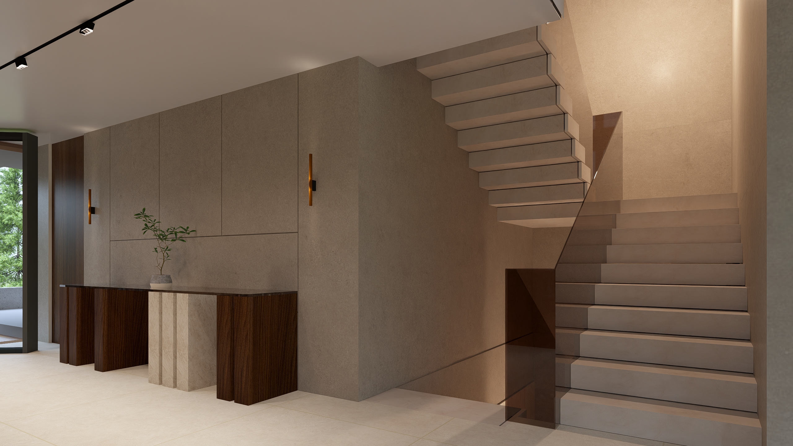 replace wooden marble table for a very light wooden table with candles and flowers on top add ceiling linear track rails black receeesed size of approx 2cm with point lights add lines of lights under each stair add details