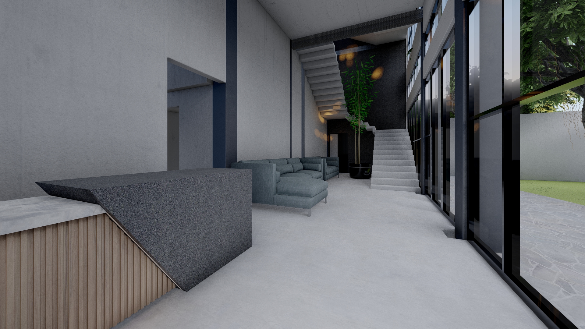 create a photo realistic render of this perspective of a small office lobby the style is industrial with a hint of modern contemporary make the scene bright and warm
