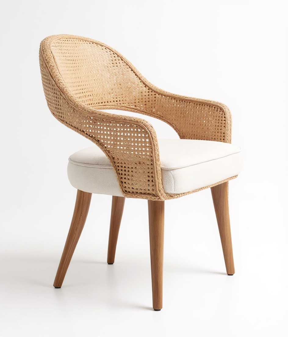 rattan raffia weaving accent white upholstered seat and back wood finish