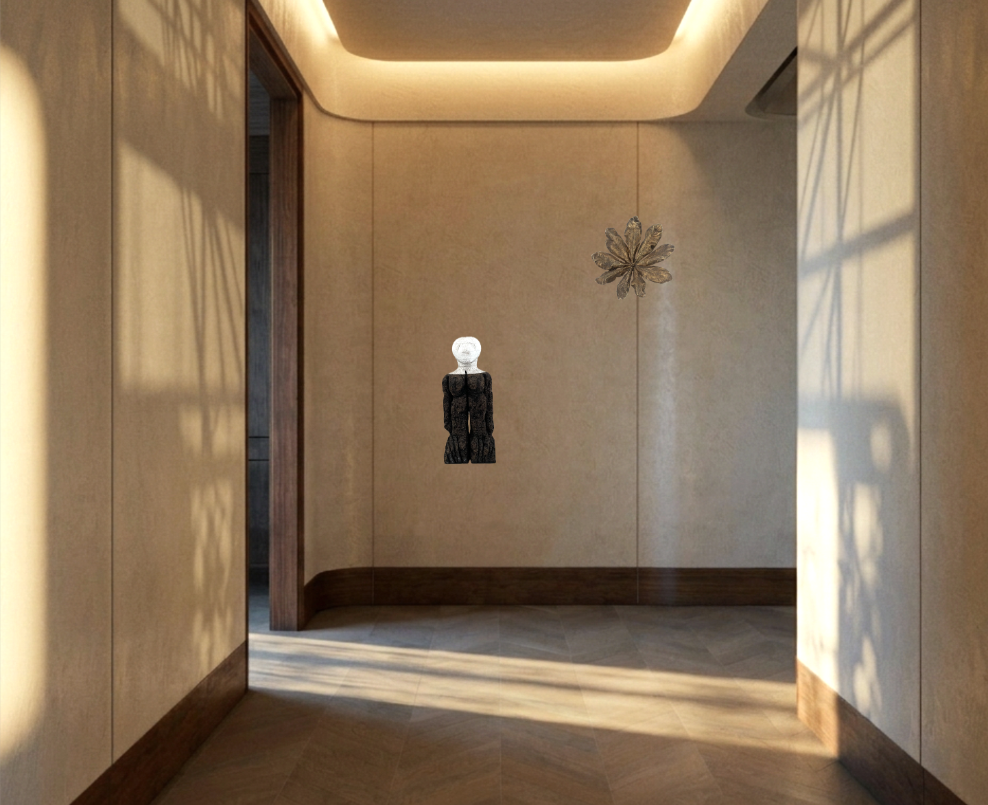 without changing the architecture room proportions artworks and finishes place a bown marble perestal under the sculpture place a simple bench upholstered in a pierre frey deco fabric on the left side wall place a mirror on the right side wall mirror should take up most of the wall create light behind the leaf sconce