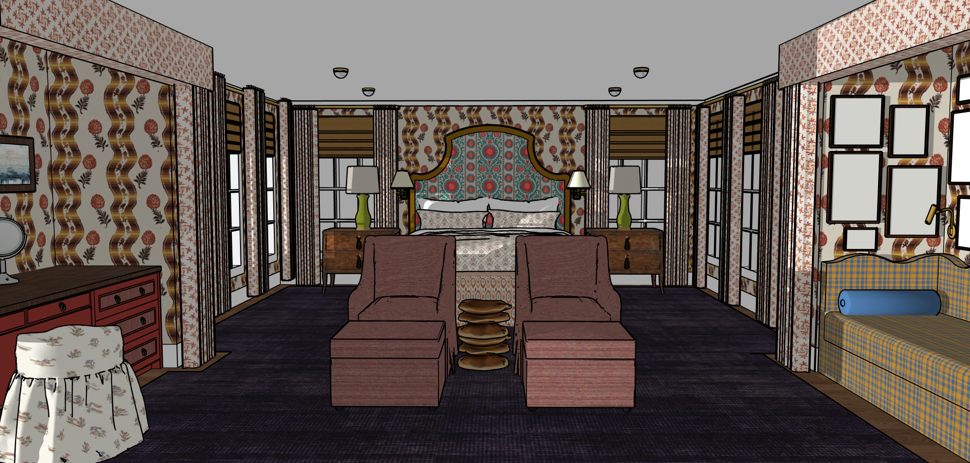 the uploaded image is a finished sketchup interior scene with final materials already applied preserve the camera angle room layout and furniture placement exactly as shown all materials must remain unchanged including the fabric the upholstery the rug the fireplace surround the mantel and the wood flooring do not reinterpret fabrics colors or textures enhance the image by adding realistic lighting shadows and material depth only to create a photorealistic architectural rendering strict preservation keep all fabrics patterns colors and materials exactly as shown material fidelity required warm lighting