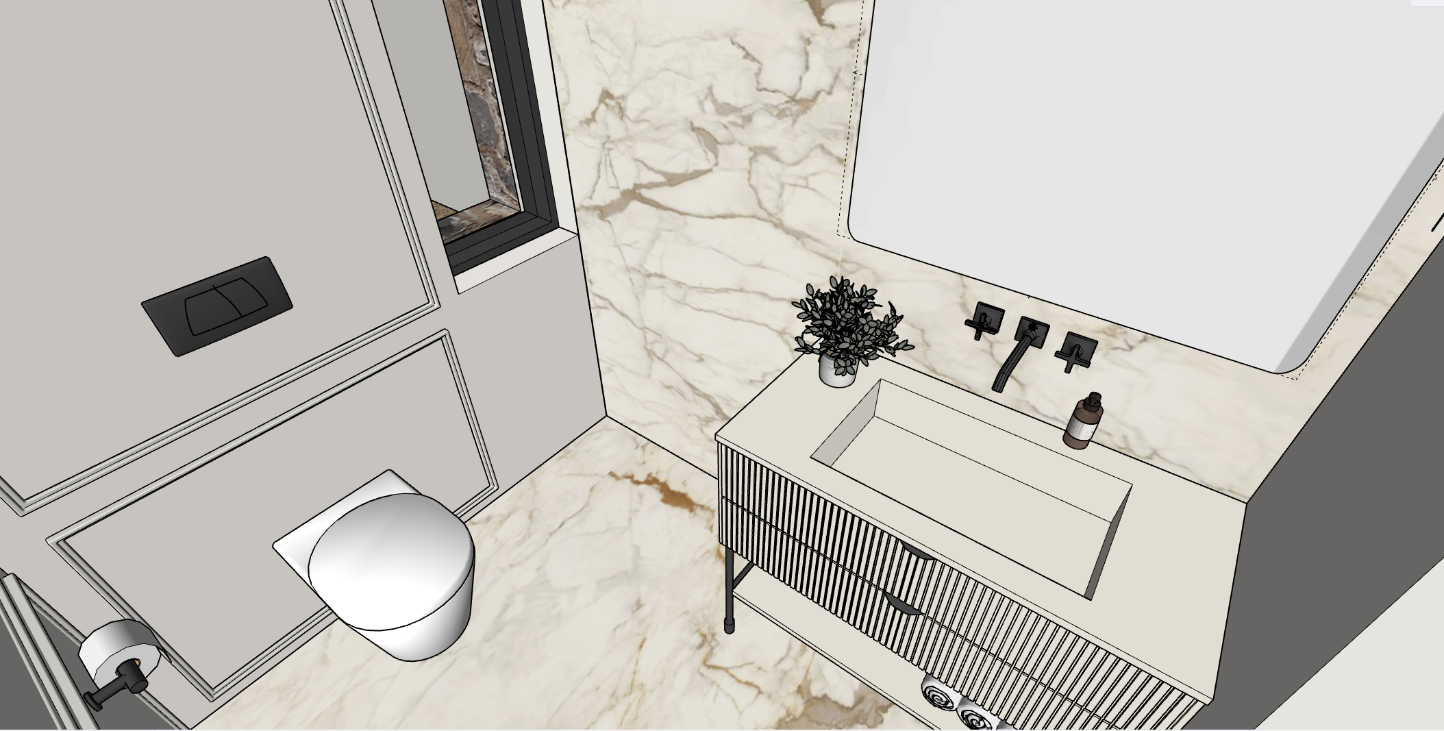 make a render for this bathroom the counter top is white corian and the cupboard is white lacquered all metals are guned metal