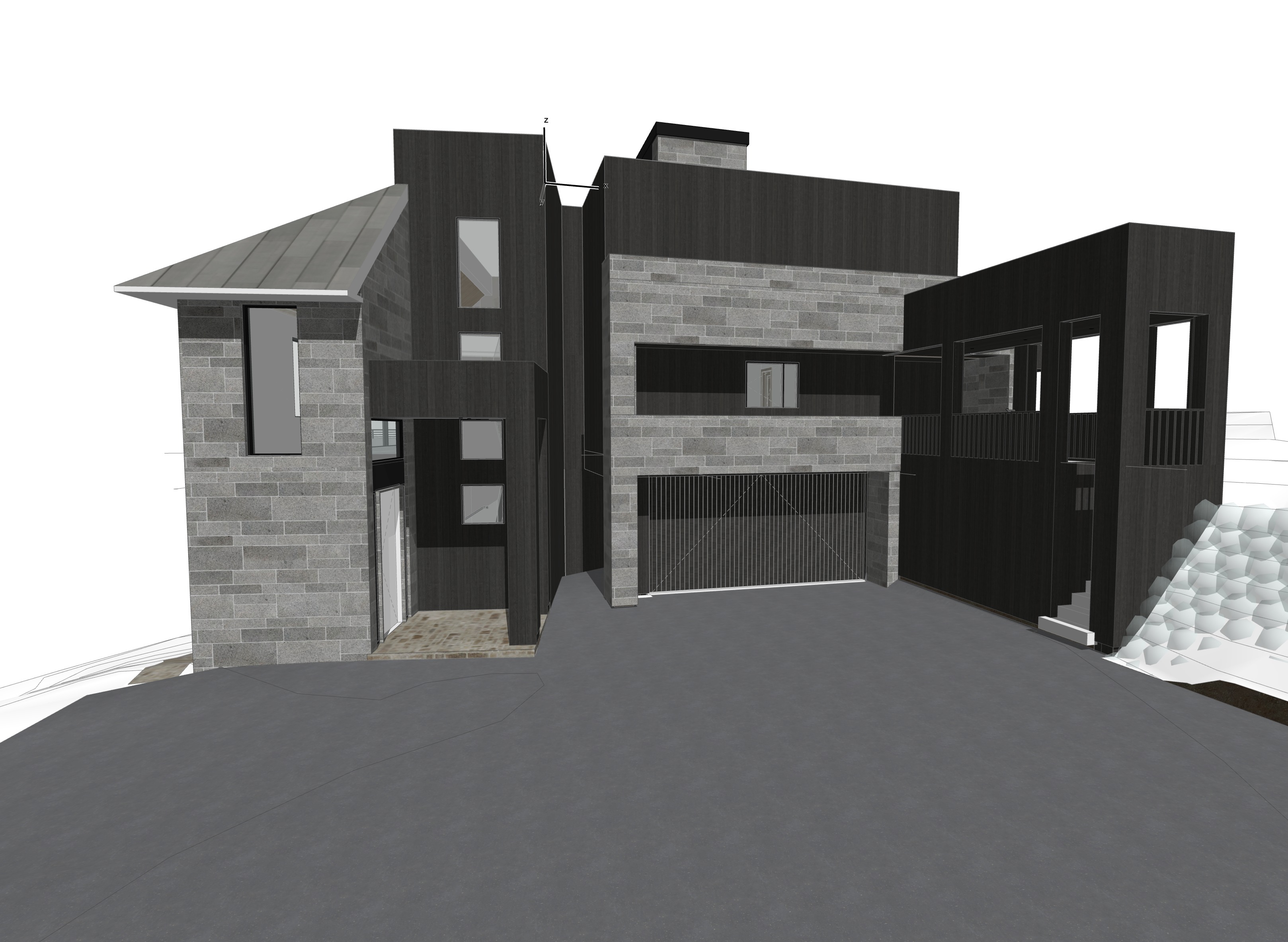 do not change the view enhance the current materials and make the landscape nicer vegetation generate with snow for winter conditions hyper realistic architectural visualization quality 8k resolution render a photorealistic 3d perspective of this house located in snowmass co reference the current material style just enhance material keep model geometry the same windows doors roof walls garage door pavement driveway maintain the extents of the asphalt driveway as in the original image