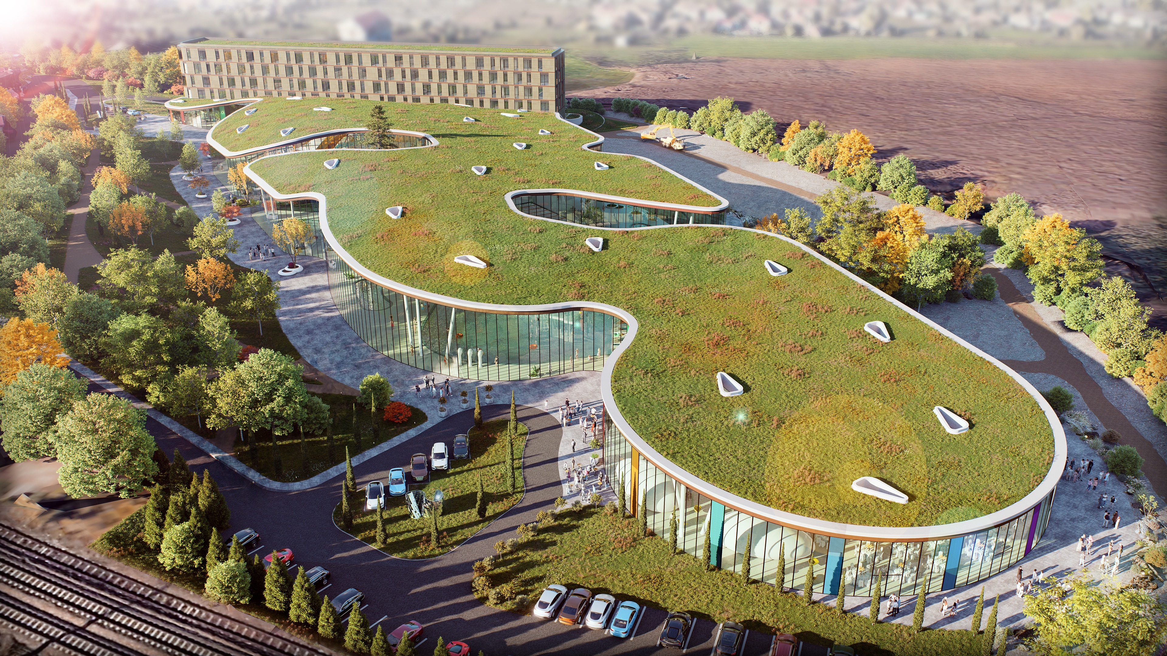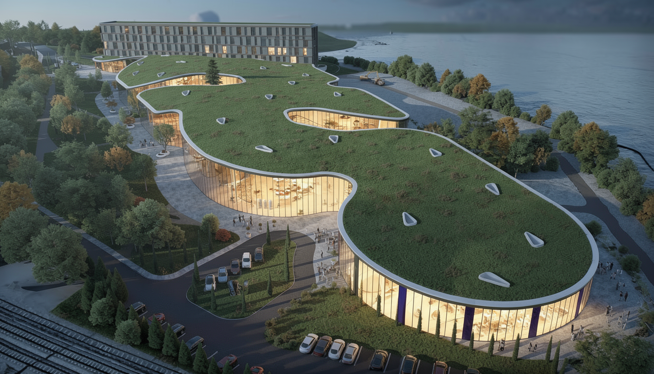 important preserve the existing geometry and the existing context exactly as provided preserve the existing windows do not add new windows do not modify alter reinterpret add remove scale or reshape any geometry do not change the site surroundings street layout neighboring buildings vegetation or context elements do not modify geometry scale proportions buildings road layout sidewalks or surrounding context in any way do not modify text soft noon atmosphere diffused neutral natural daylight with subtle cold tones cinematic architectural mood large glass surfaces with realistic reflections soft mirror effect environmental reflections of sky and surroundings important do not add new windows remove the haze remove the fog remove the lens flare