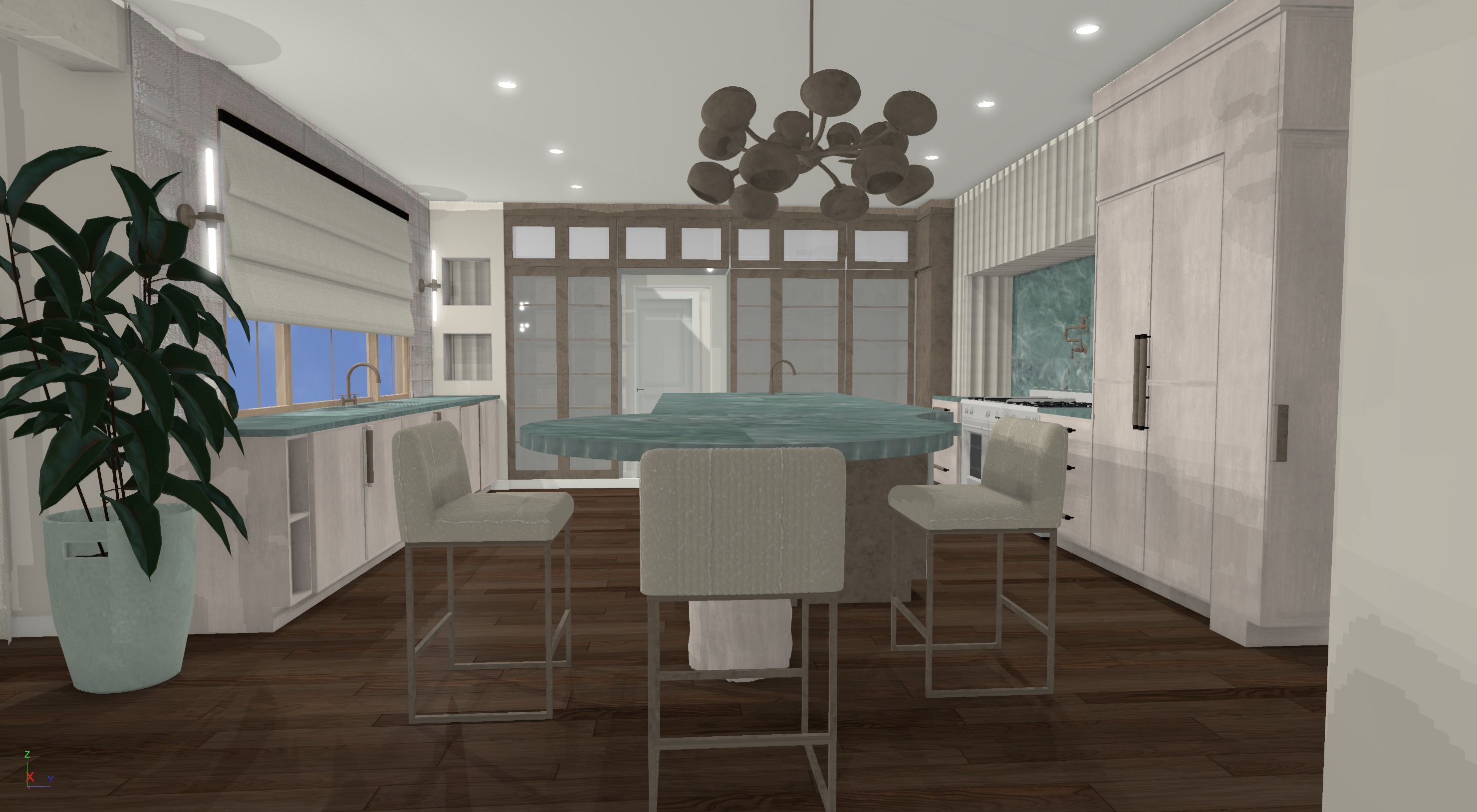 natural lighting add a large floral arrangement to the counter add dishes to bookcases cabinets are a light gray wood countertop amd stove backsplash are green marble keep bookcase the same glass bronze to the floor