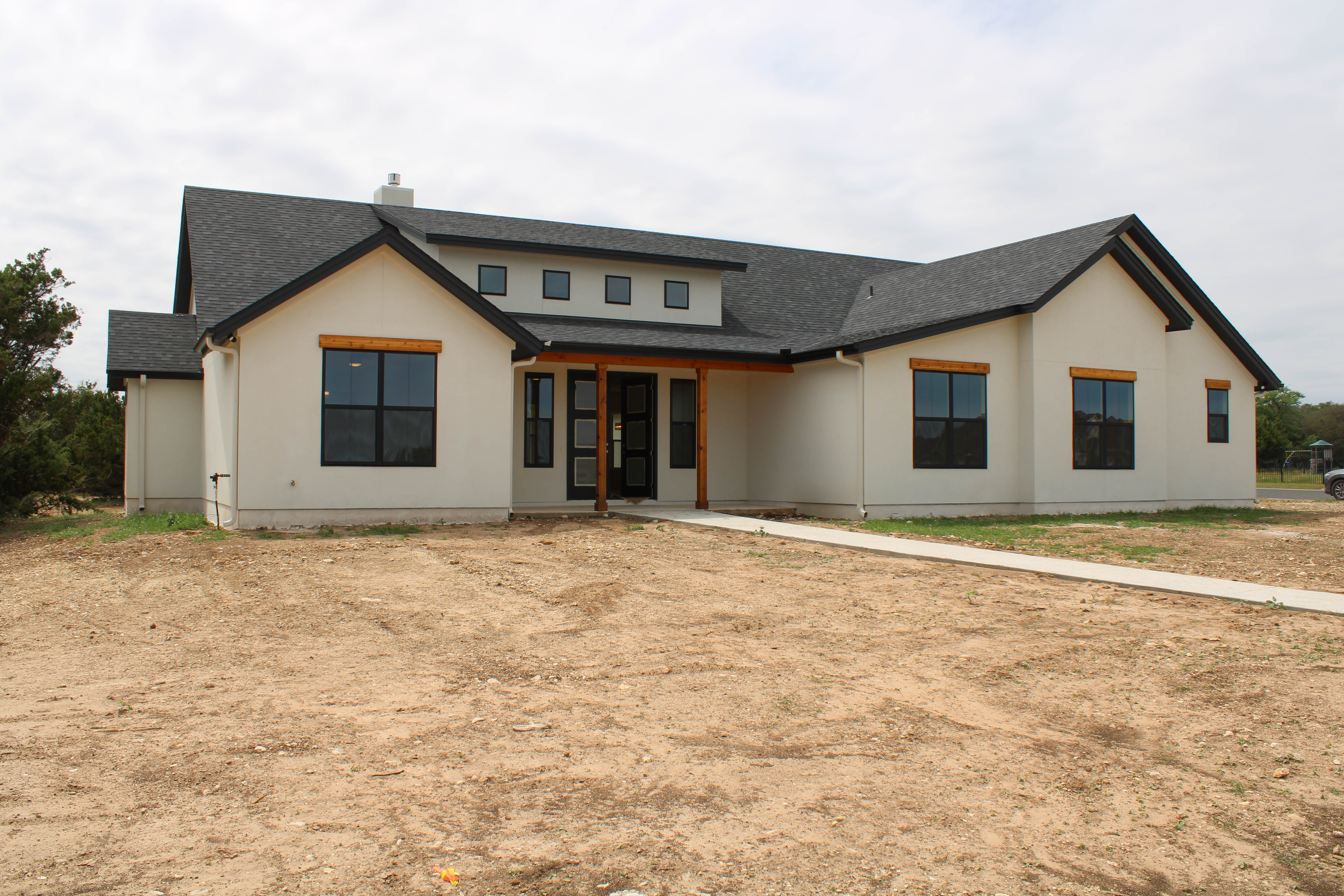 create a beautiful digital rendering of a modern suburban house with a warm and welcoming atmosphere the house should have a cream exterior and black window frames with the roof being a sleek dark charcoal gray add wooden accents in natural oak color around the windows and entrance the surrounding landscape should be grassy and well maintained with a few shrubs and small trees providing a lush green contrast the sky should be a clear bright blue with a few fluffy white clouds to add depth and serenity to the scene
