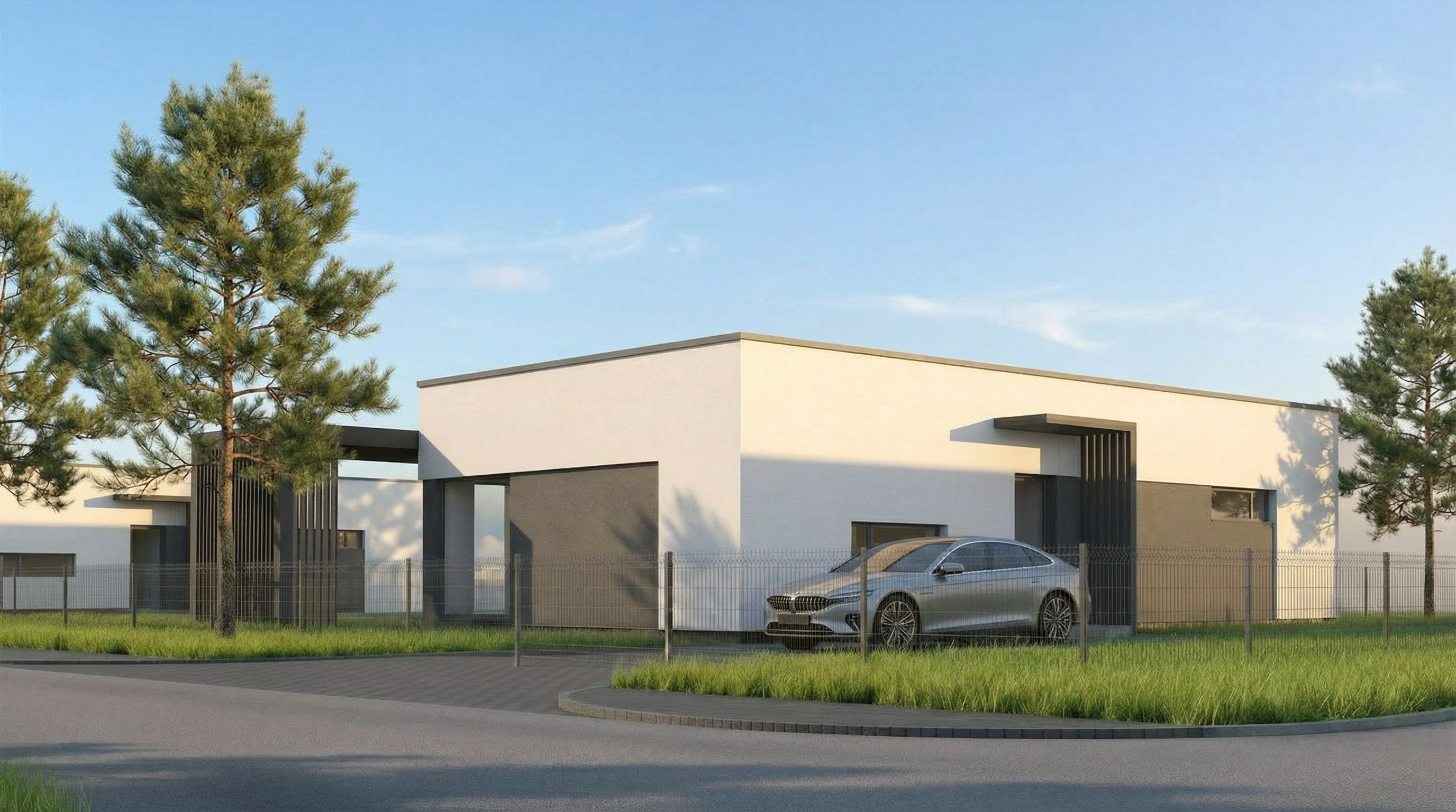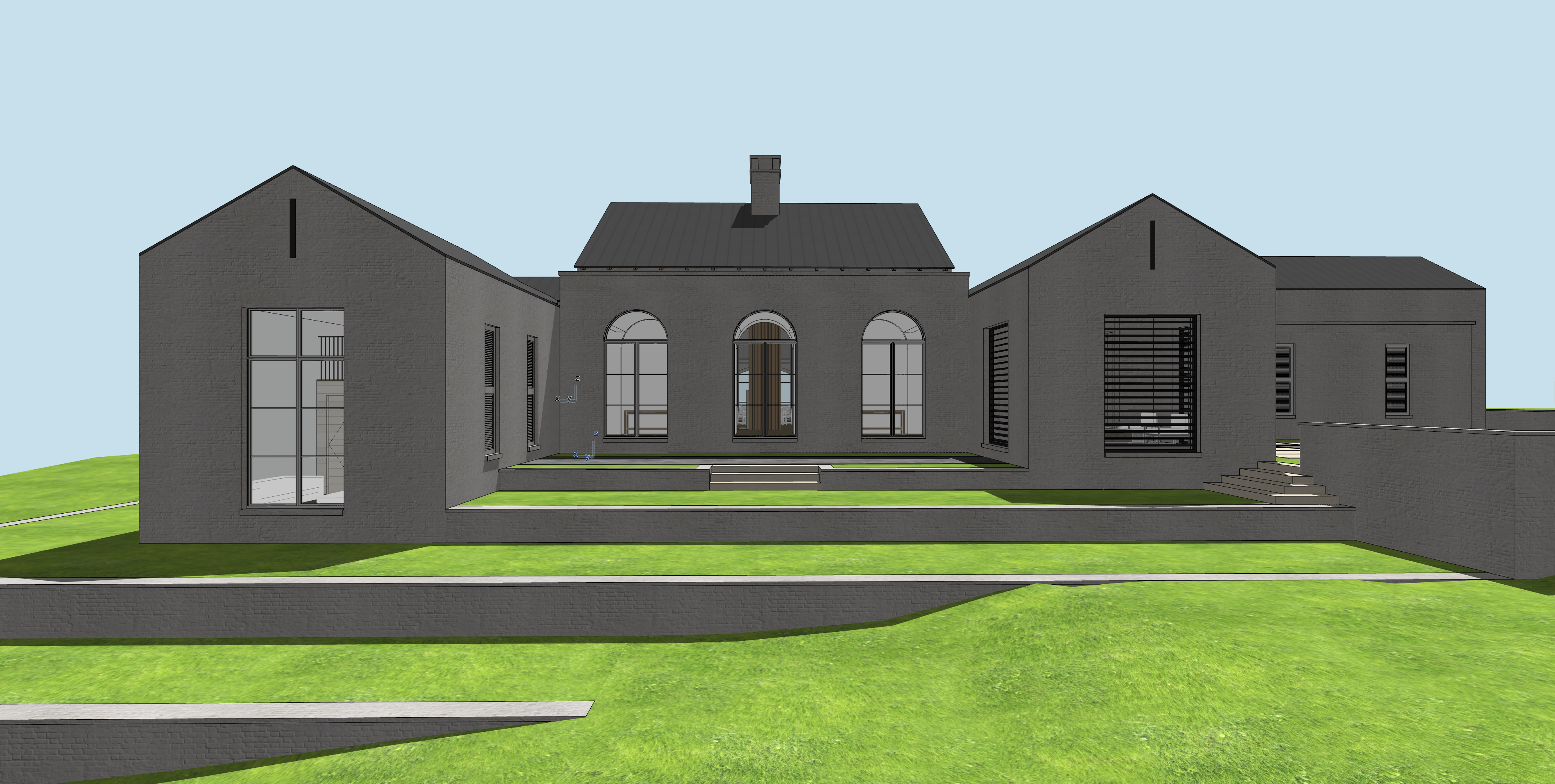 white lime washed brick manicured grass in the foreground grey standing seam roof trees in the background
