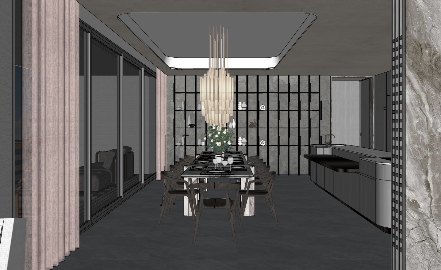 maintain the exact original architectural layout room proportions ceiling heights structural columns wall positions and openings exactly as modeled do not alter geometry spatial configuration or window placements transform only finishes materials furniture styling lighting and decorative elements to match the reference aesthetic overall design intent create a refined dark material driven luxury dining room inspired by high end boutique hotel or private members club interiors the space should feel moody textured sophisticated intimate material rich architectural emphasis on stone metal glass and warm layered lighting wall treatment large format natural stone slabs with dramatic veining deep grey taupe smoky marble tones book matched stone feature wall if compatible with geometry matte or honed finish not glossy subtle shadow joints between panels dark charcoal or near black painted walls in secondary areas minimal ornamentation walls must feel heavy architectural and tactile flooring dark concrete or polished microcement flooring slight industrial character subtle texture variation matte finish natural tonal depth no patterned tiles no bright flooring dining table solid round or rectangular stone table deep grey or dramatic marble with strong veining thick slab appearance sculptural base cylindrical or monolithic form matte or lightly honed surface table must feel heavy and sculptural dining chairs low profile modern dining chairs upholstered in dark charcoal deep navy or black fabric slim black metal base clean minimal lines soft matte finish no ornate detailing feature bar back wall if applicable backlit glass shelving with metal frame grid bronze or brushed brass detailing warm integrated led lighting behind bottles reflective glass panels for depth symmetrical architectural grid layout lighting should glow warmly through glass layers metal accents brushed bronze or brushed brass rails minimal linear suspended metal elements subtle metallic warmth contrasting stone no polished chrome metal must feel refined not flashy lighting moody layered set scene at evening lighting requirements warm ambient lighting 2700k 3000k hidden linear led strips wall grazing to emphasize stone texture subtle pendant or linear suspended light elements controlled contrast not overly bright soft shadows with depth no harsh spotlighting lighting should create intimate luxury mood decor styling minimal decorative objects one sculptural art object dark or deep jewel tone elegant glassware styling if bar present no clutter no bright colors styling must feel curated and restrained material realism ultra photorealistic rendering accurate marble veining scale realistic stone roughness and depth subtle metal reflectivity real glass reflection and transparency balanced global illumination no hdr exaggeration no artificial bloom effects camera direction 35 45mm architectural lens slightly framed view with layered foreground subtle depth composition clean vertical lines balanced symmetry if appropriate professional architectural photography style overall goal create a high end dark moody dining room interior with sculptural stone presence refined metallic accents and layered warm lighting suitable for luxury hospitality presentation or ultra premium residential design