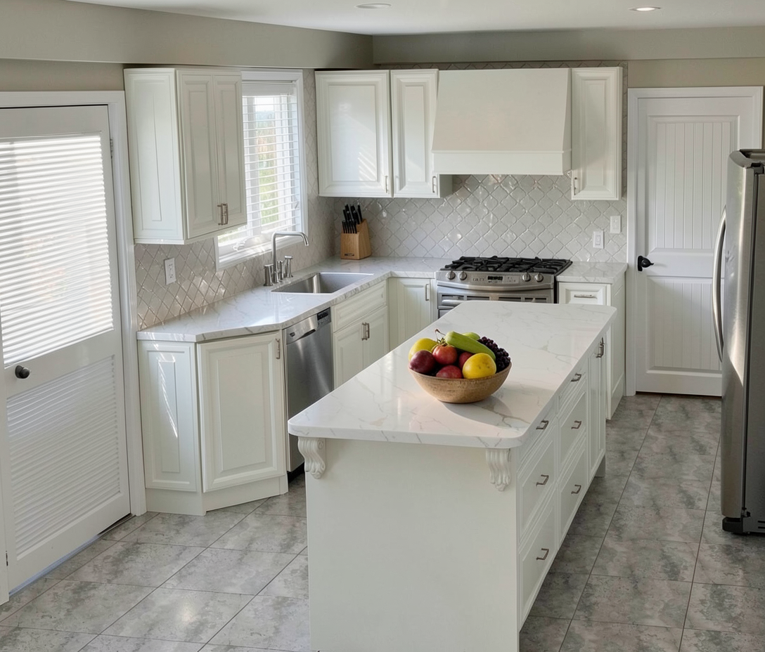 it s important to keep the sizes of everything the same change textures and materials but keep the sizes of everything the same make rock realistic its important to keep to scale this room is big do not change size of windows or doors do not add doors or windows do not change or add fixtures warm modern luxury kitchen large waterfall island with light gray marble or quartzite subtle veining polished finish thick countertop profile full height slab waterfall edges light natural wood cabinetry mixed with painted off white cabinets flat panel doors minimal hardware integrated appliances soft warm lighting oversized pendant lights with pleated fabric shades and brushed brass accents tall brass faucet neutral color palette creamy whites warm taupes light wood tones wide plank oak flooring clean and minimal styling high end residential design soft ambient glow architectural visualization ultra realistic 8k detail add tile back splash between base cabs and upper cabs add large art piece on big back wall