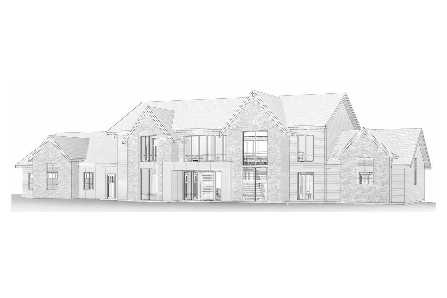 clean modern architectural exterior rendered in cinematic bright golden hour lighting cool tone stone siding under the gable ends white stucco siding on the rest of exterior concrete driveway leading up to the house black overhang and sides around the front door black standing seam metal roof visible prominent cinematic hills and trees landscape in the background natural wood textures high fidelity photorealistic visualization crisp shadow falloff refined facade geometry richly detailed grain patterns soft atmospheric depth premium architectural photography mood ultra clean composition and materials
