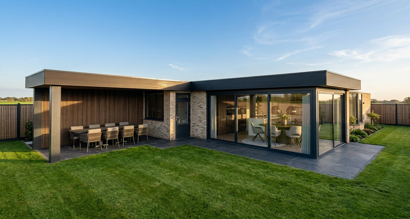 timeless classical two storey family house with attached front garage emphasized entrance next to the garage large covered front veranda with barbecue and outdoor seating area pitched roof with anthracite roof tiles elegant light plaster facade landscaped front yard with trees and lawn paved driveway high end residential architecture photorealistic render soft daylight ultra realistic