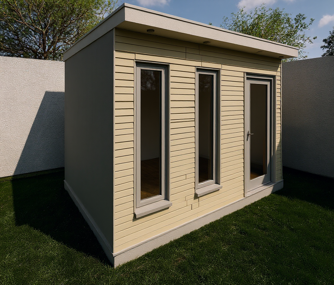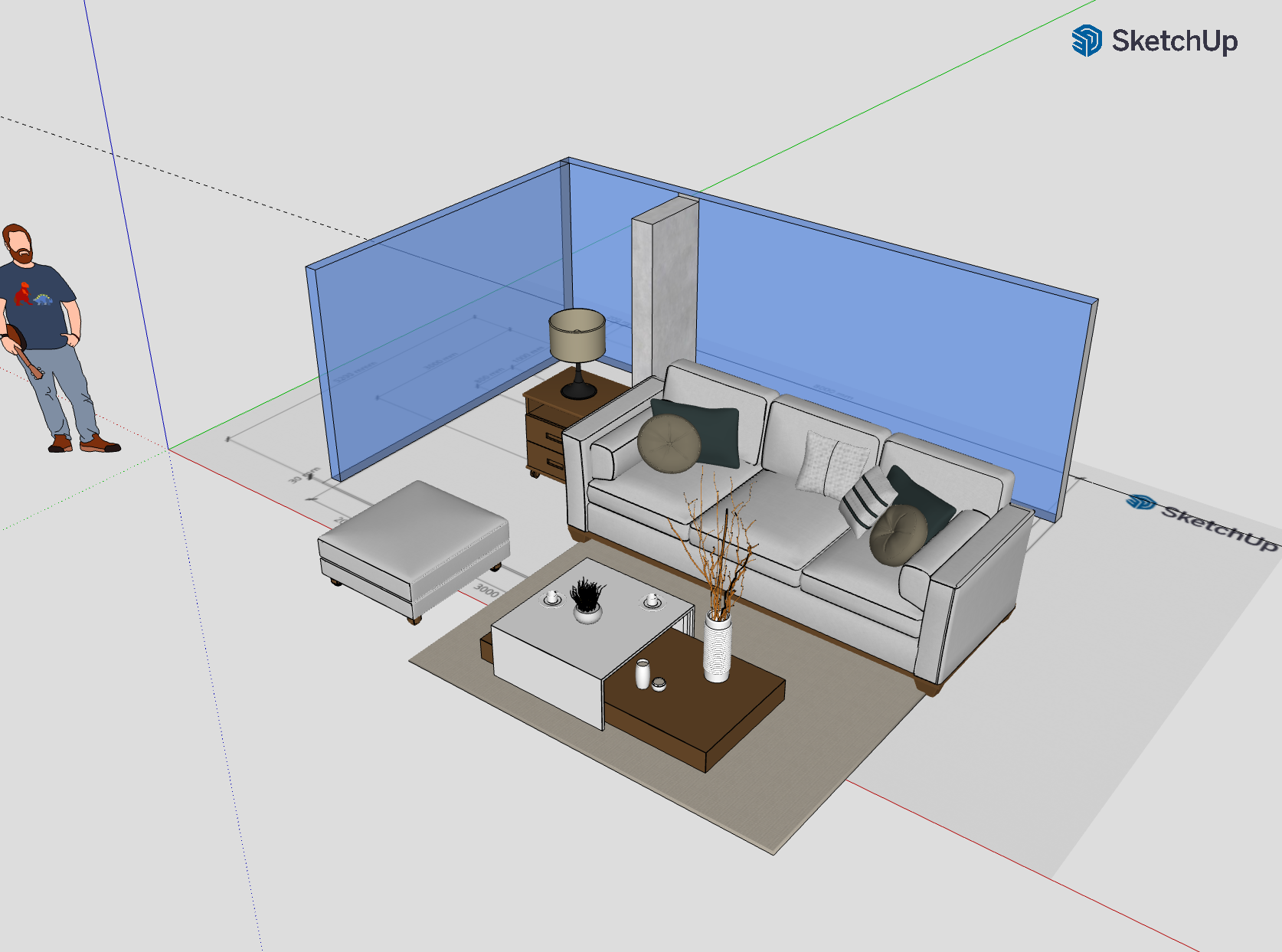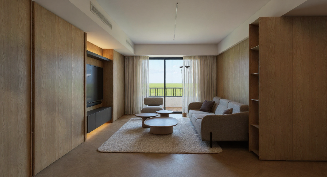 interior shot create a beautifully rendered modern living room with a minimalist design center a sleek grey sofa with plush cushions in neutral tones such as beige and charcoal position a smooth brown wooden coffee table in front with a glossy white top for contrast include elegant vases with dried branches and small decorative items in white and silver place a stylish light wood side table next to the sofa topped with a chic beige lamp the floor should feature a soft light grey carpet incorporate a frosted blue glass partition with a clean modern look for added sophistication set an inviting and serene atmosphere with soft warm lighting that gives a cozy yet modern vibe