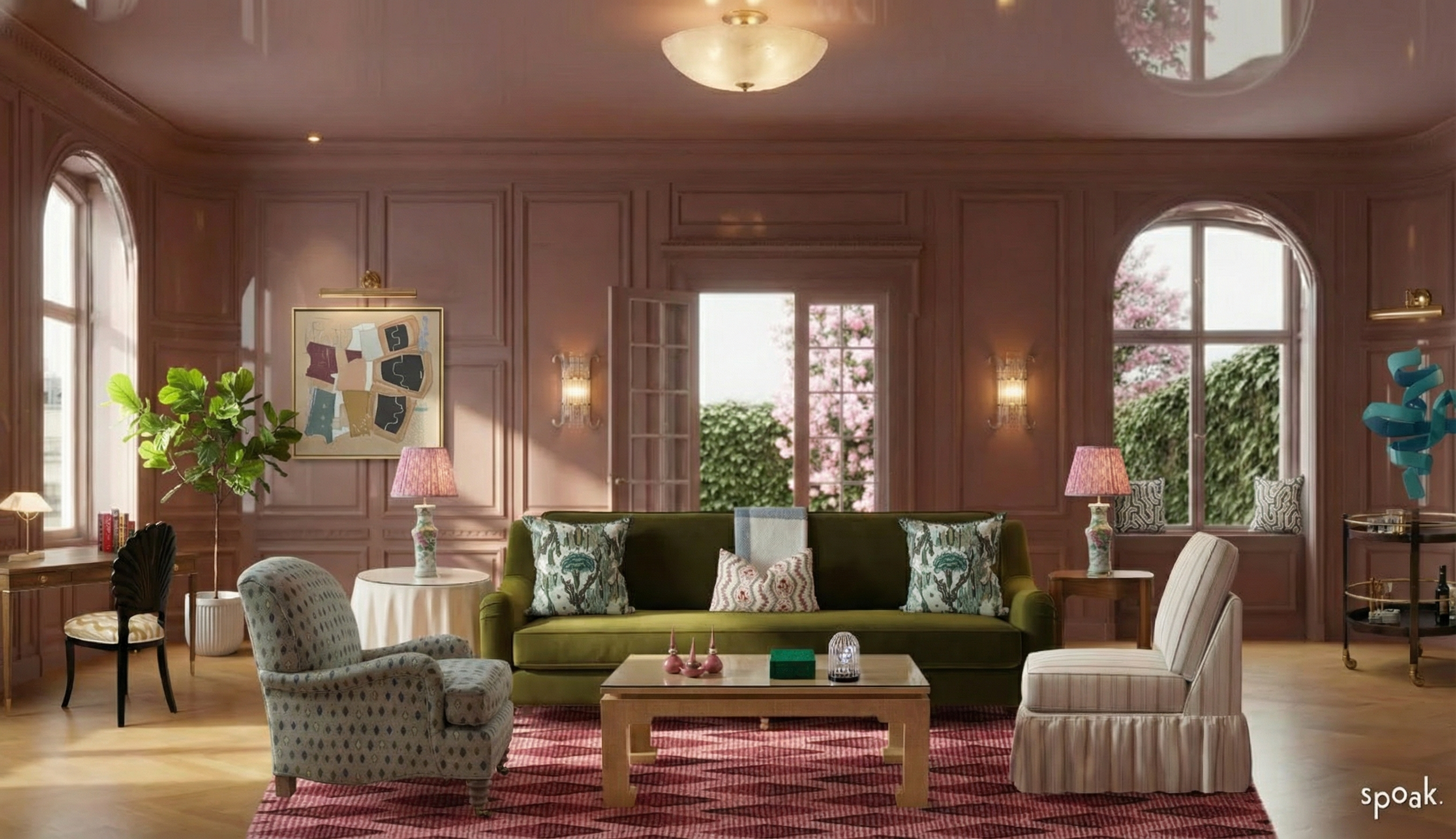 transform this into an ultra real interior photograph do not add remove replace distort repaint or redesign anything do not change the furniture art styling patterns colors proportions layout or any objects do not alter any artwork textiles throws or the writing on books preserve every element exactly as it is your only task is to improve physical realism introduce correct gravity and weight to all objects refine true to life lighting behavior realistic shadow casting and contact shadows natural exposure roll off subtle atmospheric depth correct surface response fabric softness wood absorption metal highlights glass behavior the result should feel like a professionally photographed interior for veranda architectural digest shot on a high end lens natural light physically believable not stylized not illustrated not redesigned the space must remain identical only realism and photographic quality are enhanced do not turn lamps and scones on