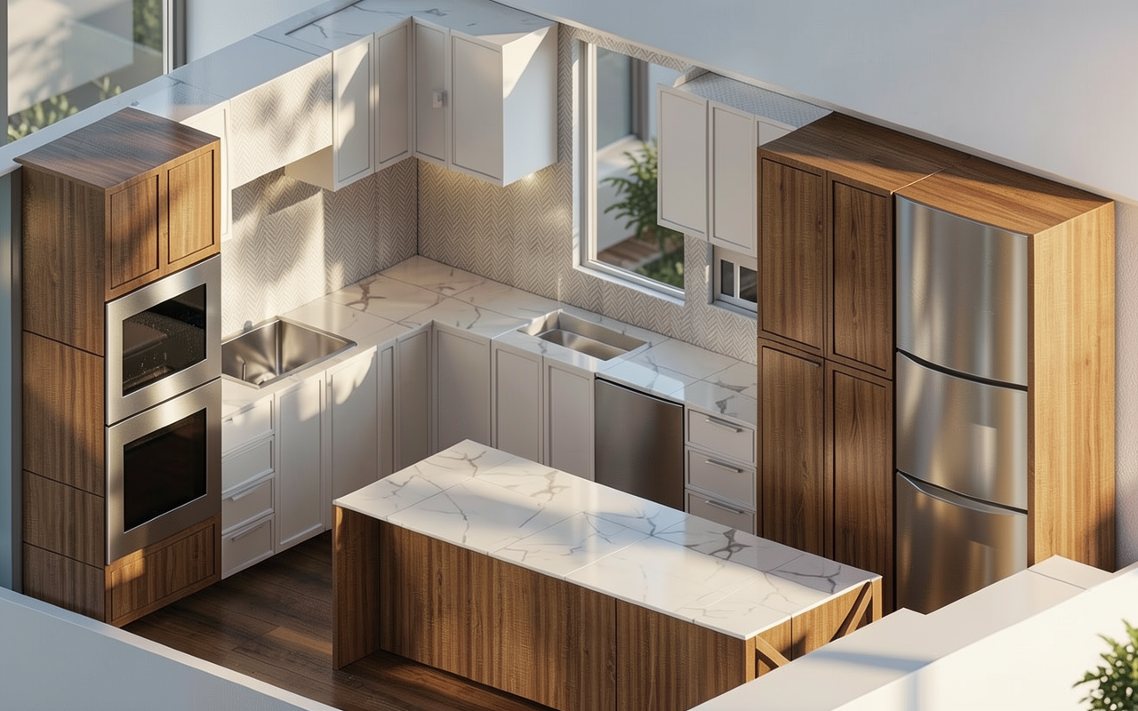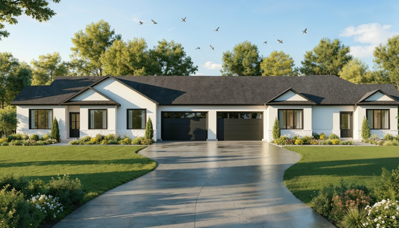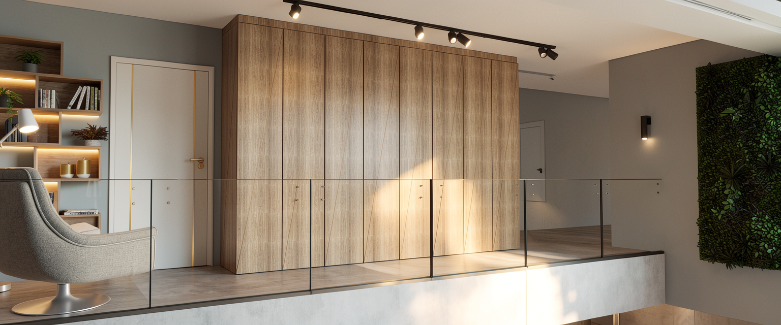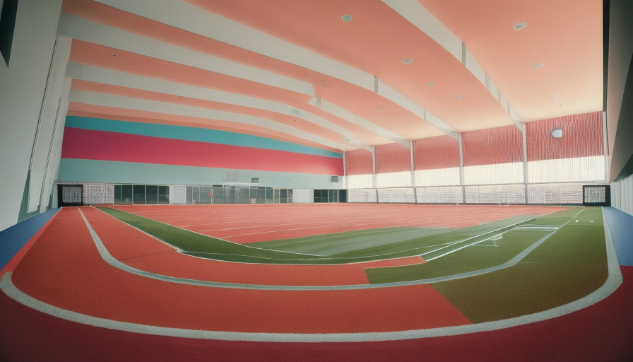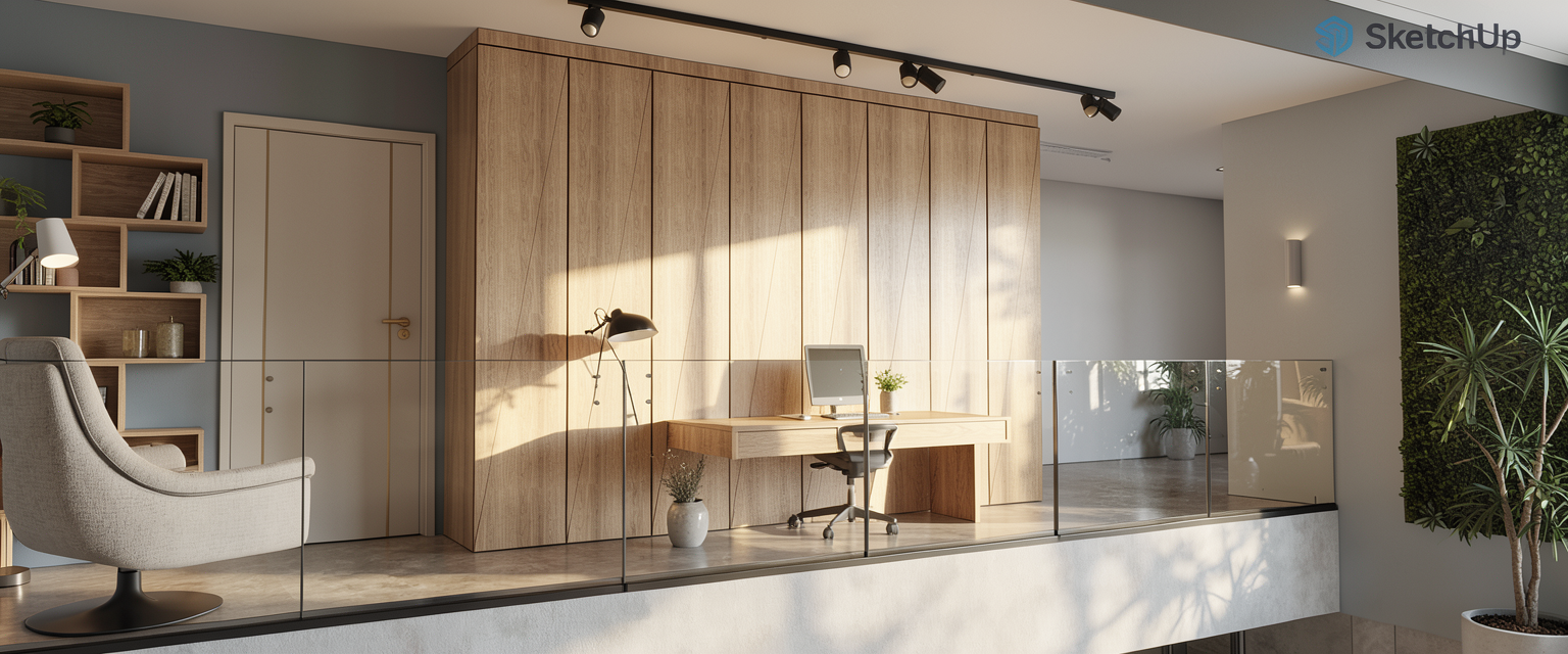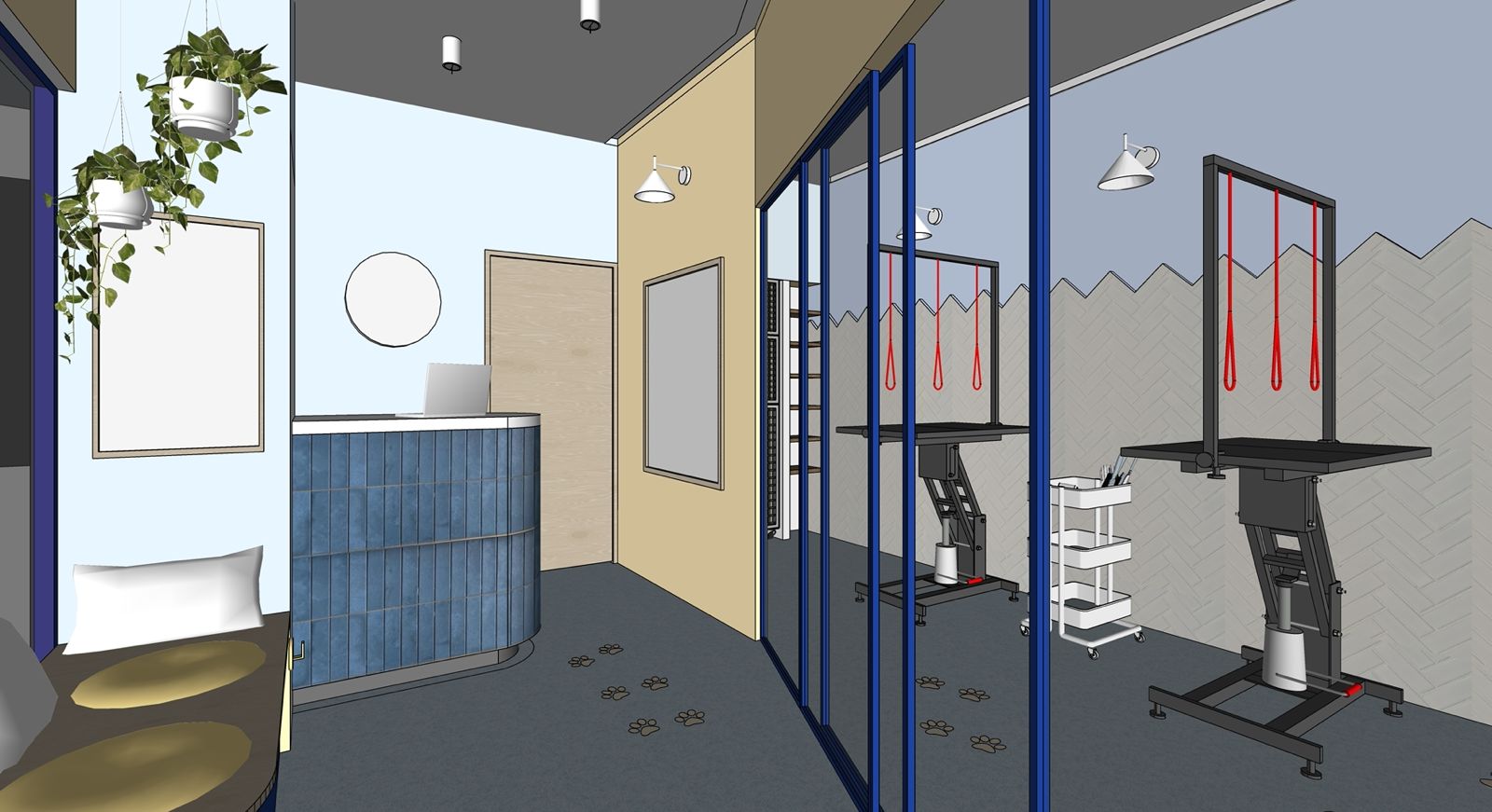 render a modern veterinary clinic interior with a cozy atmosphere walls are light blue with soft mustard accents hanging plants in white pots add greenery the reception desk is decorated with blue tiles and a white countertop the lounging area features brown cushions with golden yellow circles the floor is covered with a dark gray carpet featuring paw print patterns on one side a glass partition framed in bold blue separates the treatment area treatment tables are sleek with black metal frames accented by vibrant red straps soft ambient lighting from white ceiling fixtures enhances the warm and inviting vibe of the space no sunlight raytrace
