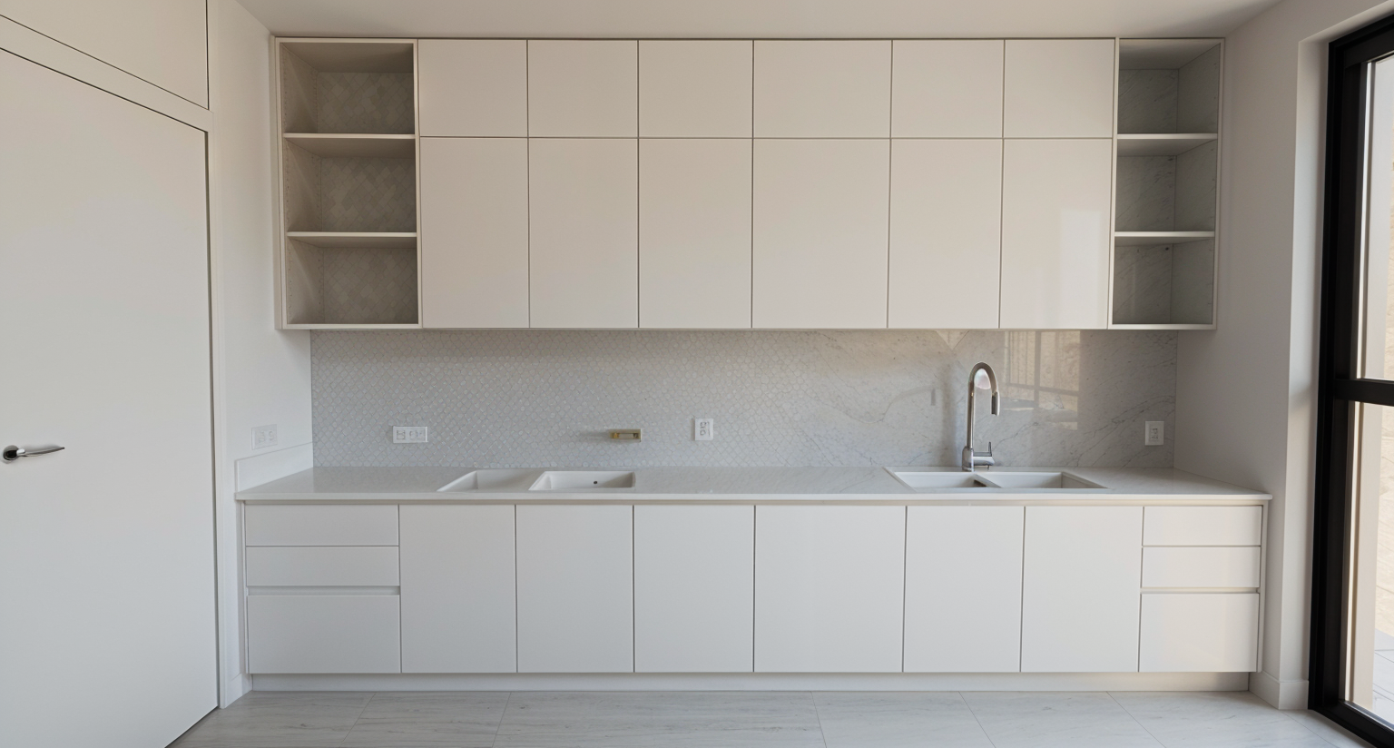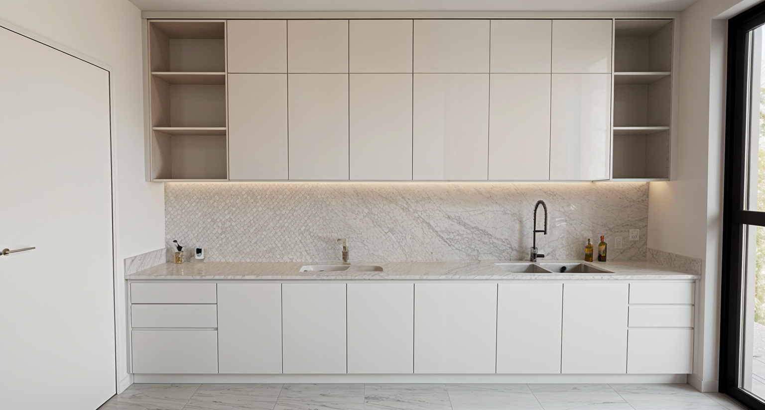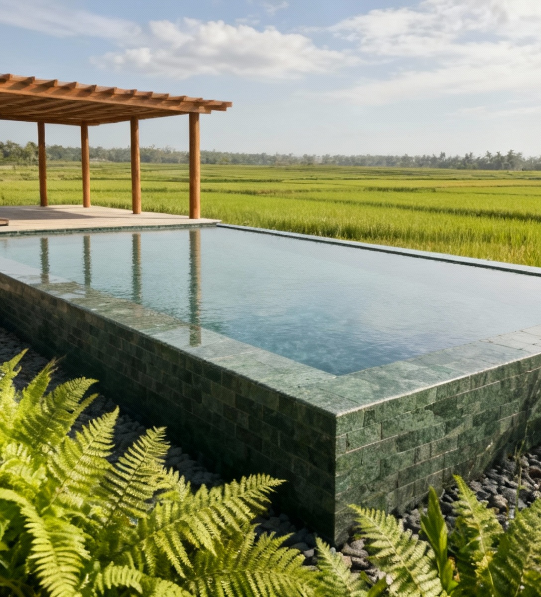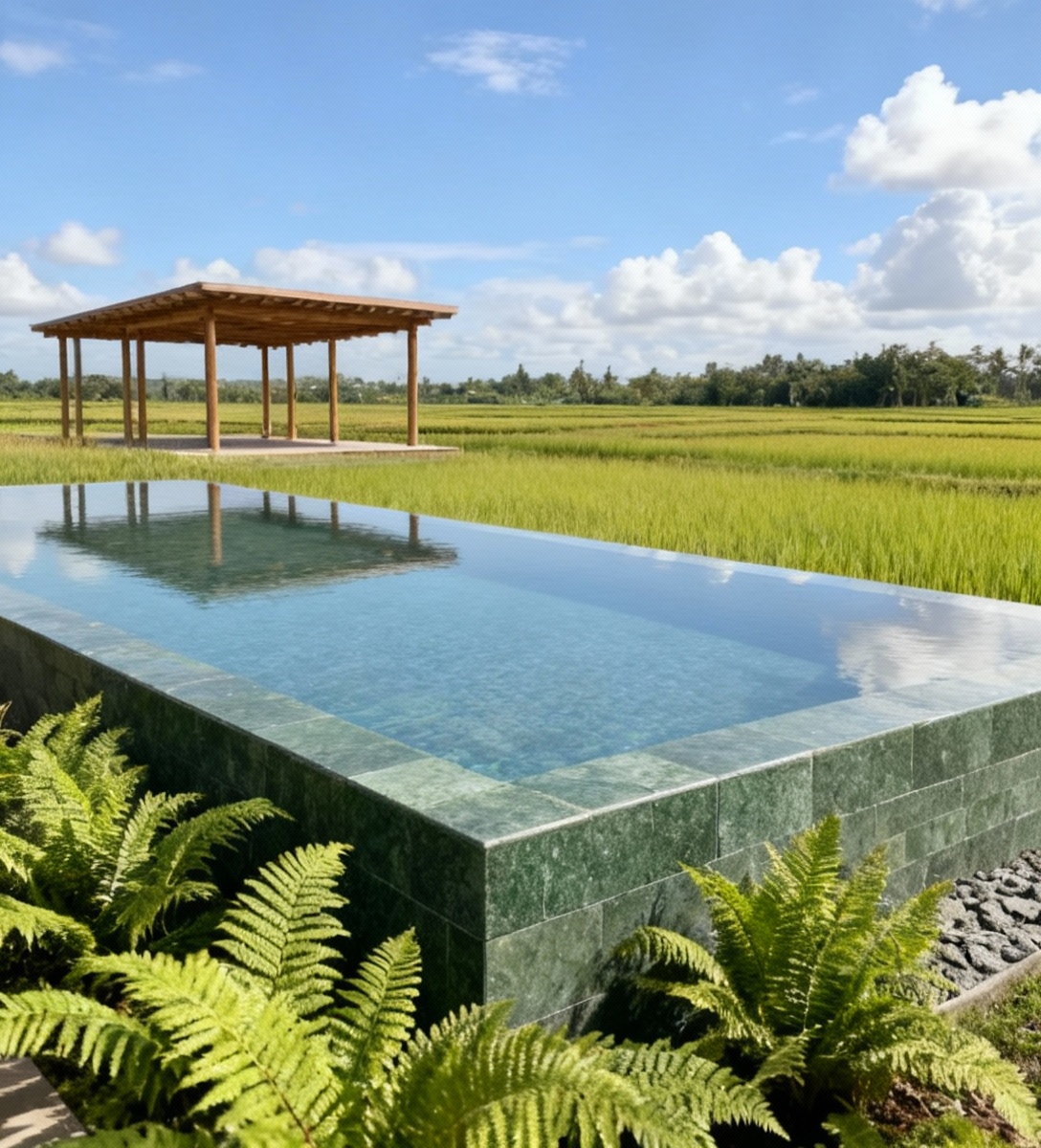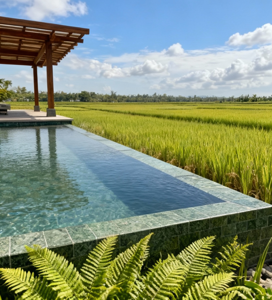 change all landscape to ricefields remove all trees to make ricefields until the horizon and under beautiful blue summer sky with white clouds the long pool is clad with bali green andesite remove the white wall in the background plants immediately near the pool are lush ferns in the foreground the perspective image frame is maintained same as the reference image