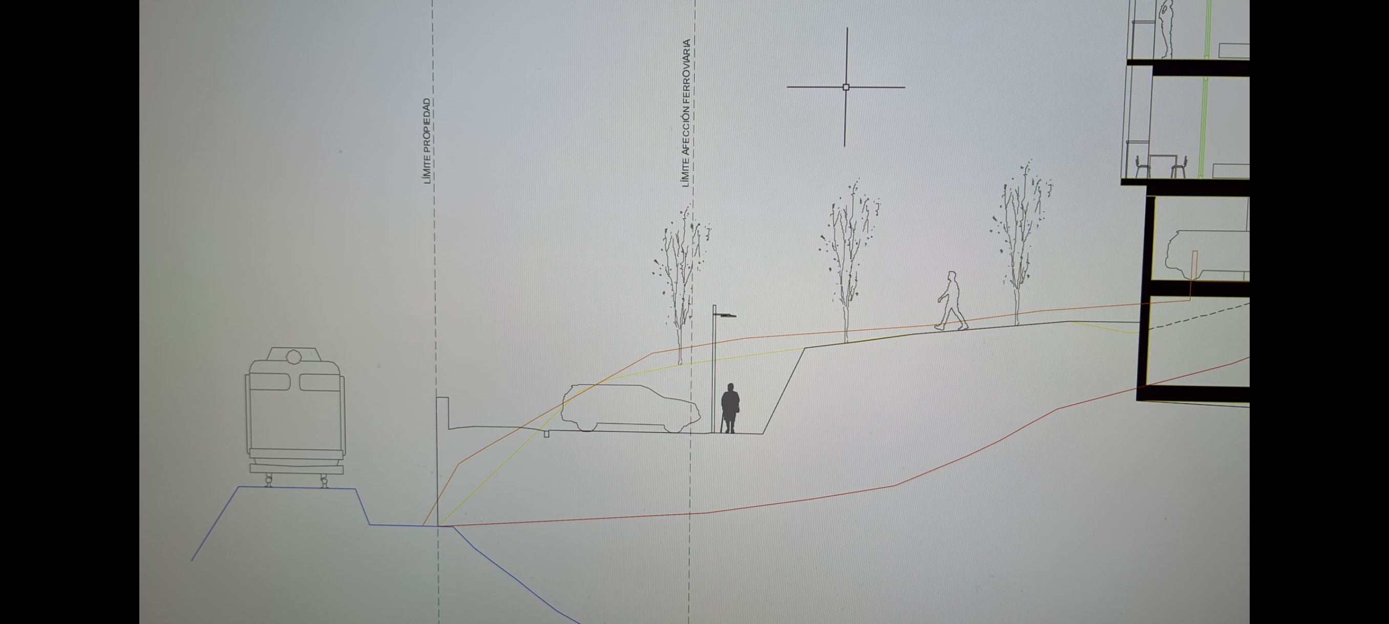 exterior shot un paseo mar timo al lado de una v a de tren una persona pasea por el paseo donde tambi n aparca alg n coche hay un talud en el margen derecho y un edificio encima los cambios de nivel del terreno son bancales muy naturalizados a la izquierda de la v a del tren se ve un paisaje marinero
