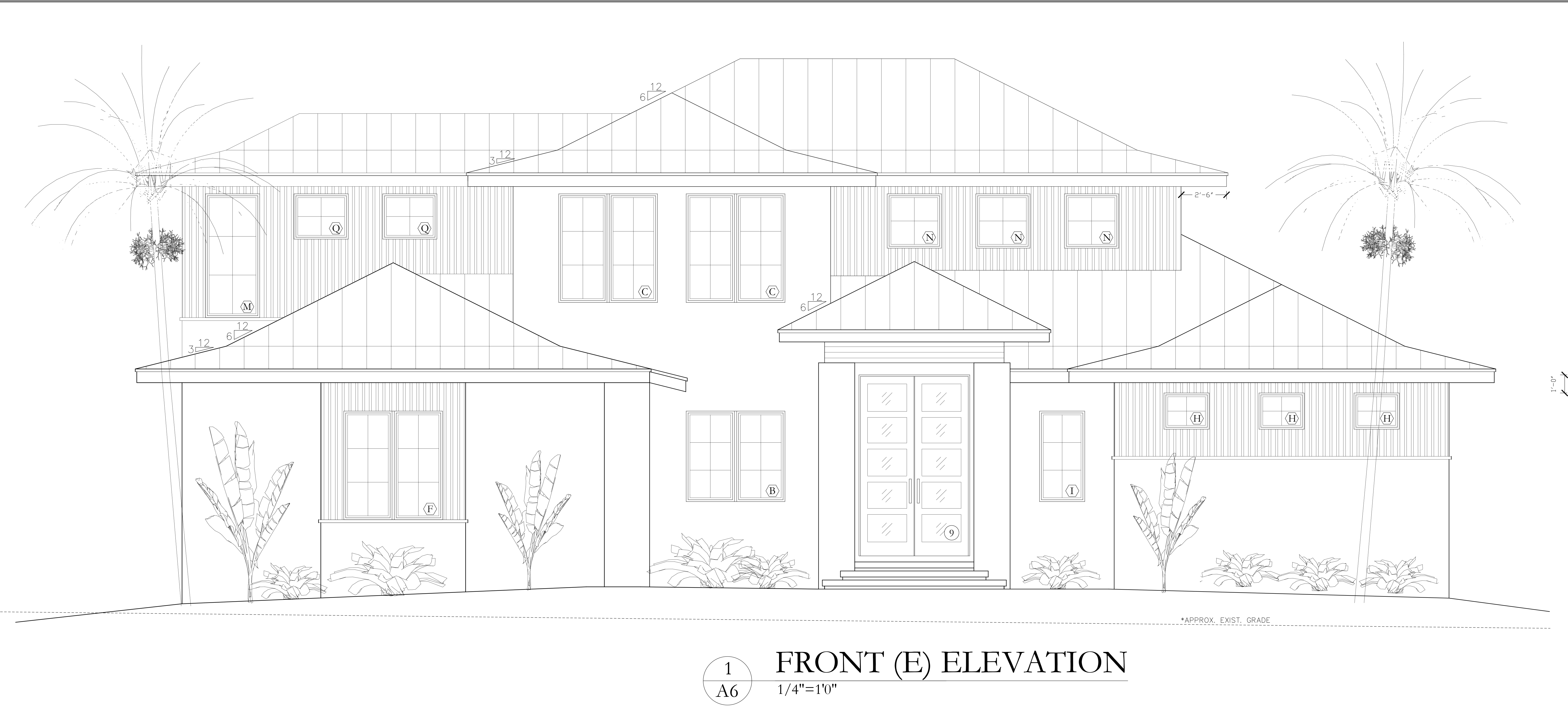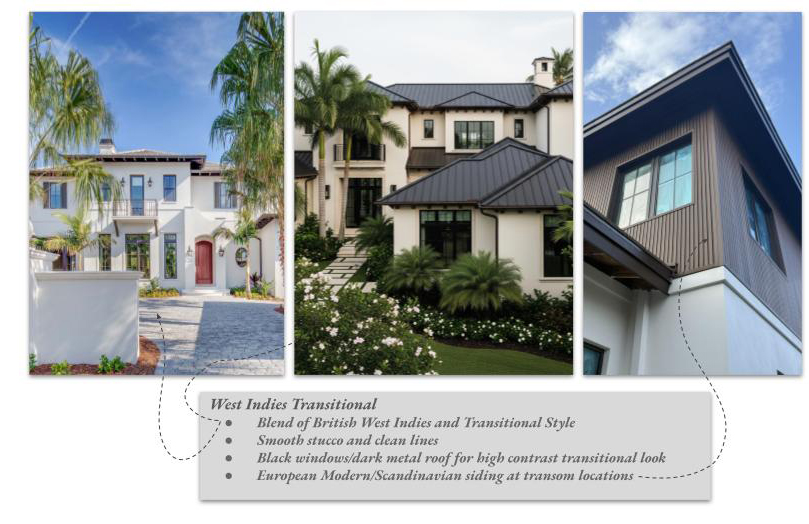 exterior shot a modern south florida residential home with black windows surrounded by tropical landscaping evening light scandinavian accents realistic technically detailed rendering
