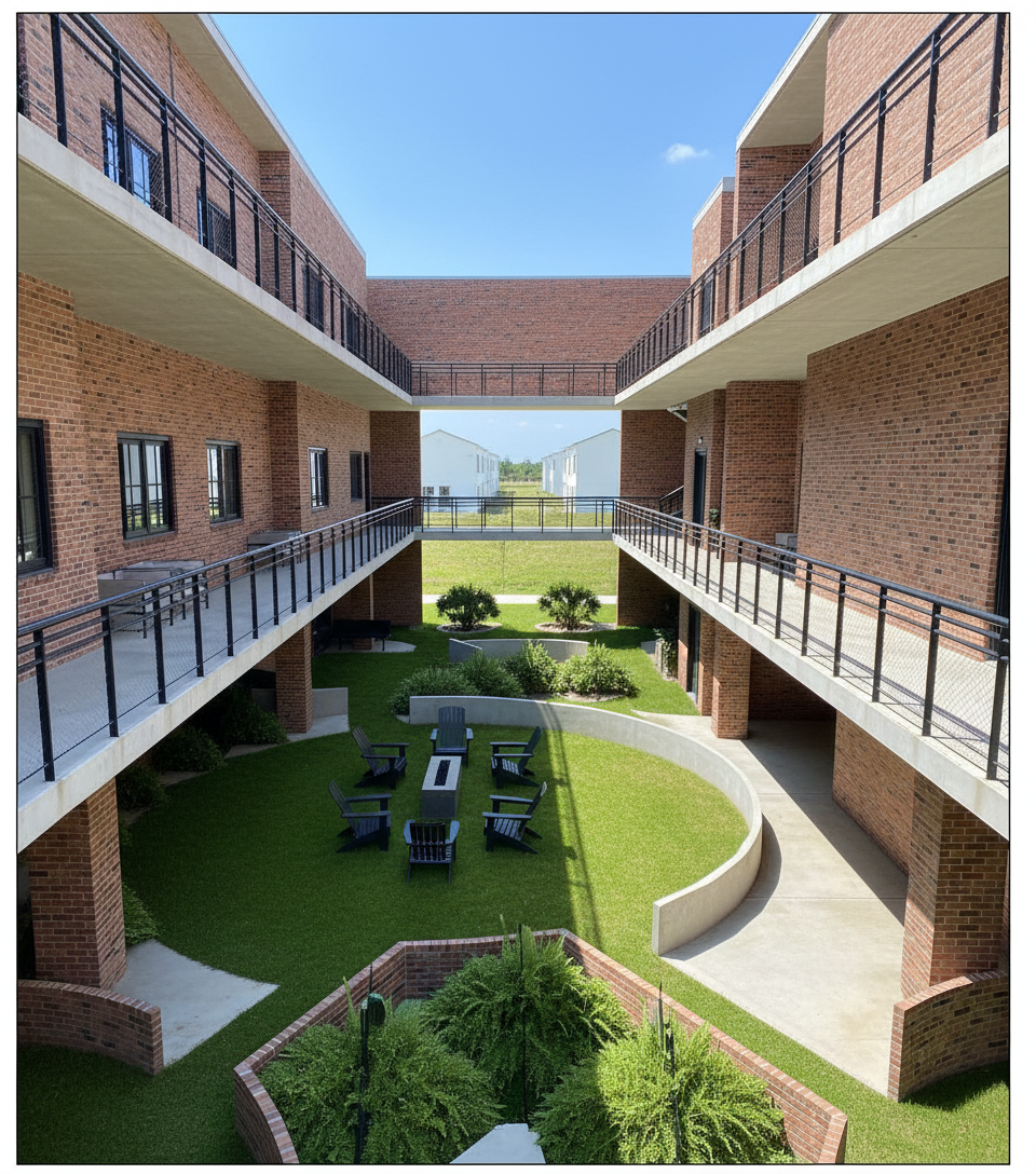 all walls are brick cladded the floors are concrete the short walls on the ground level are brick cladded on the ground level the walkways and circular seating areas are concrete and the areas around the walkways are grass there should be a clear opening to the back there are small white solid buildings in the background and a blue sky