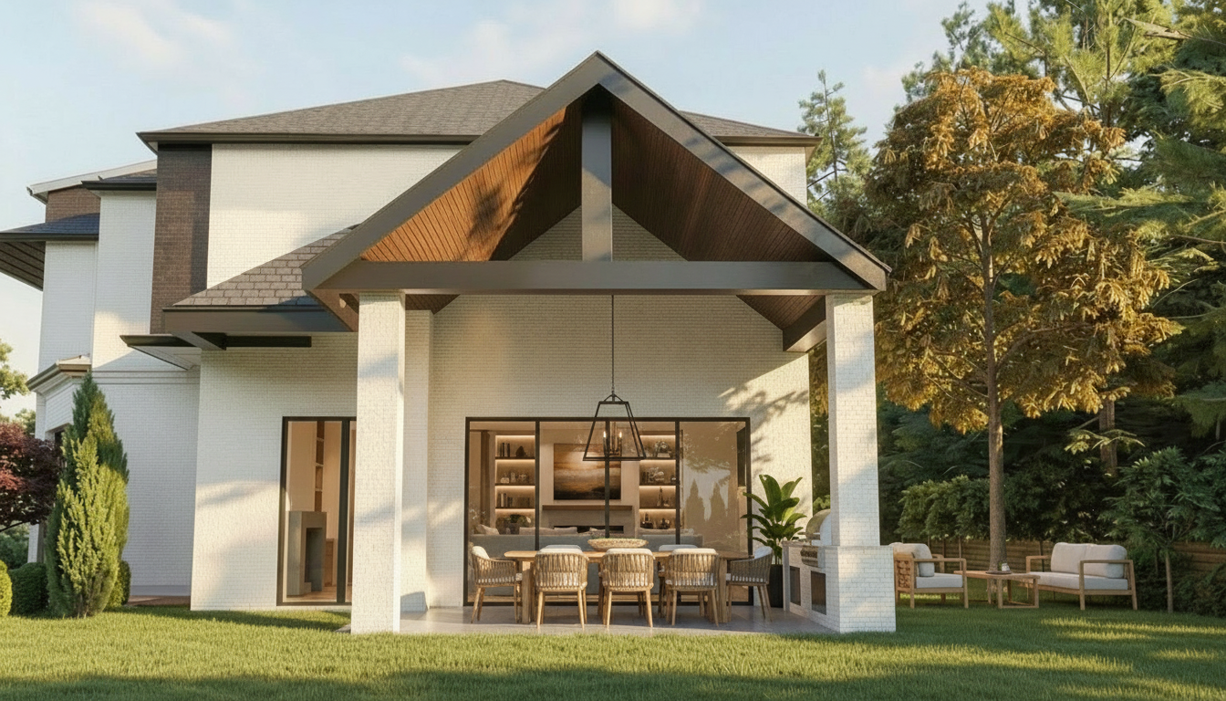 facades enduites a la chaud corniches pierres menuiseries gris clair porte de garage avec vitres en partie haute entourage fen tre en pierre
