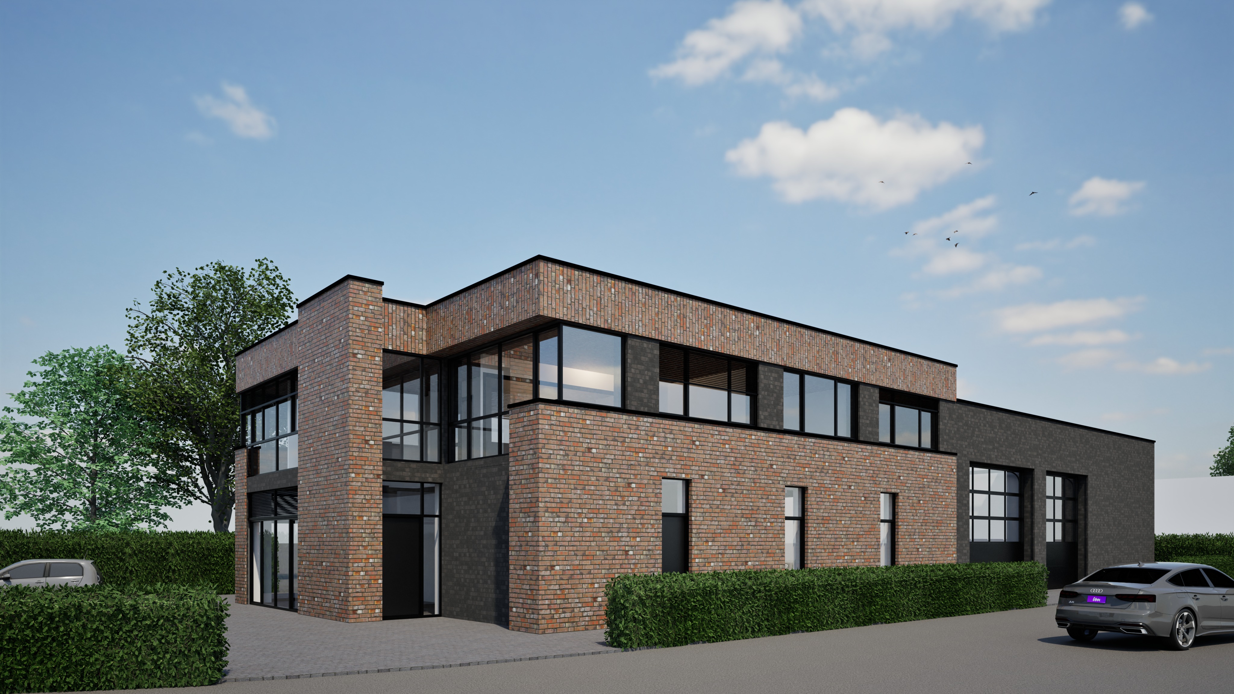 ultra photorealistic architectural photo transformation use the uploaded rendering strictly as reference preserve exact geometry facade layout brick pattern joint alignment proportions camera position and composition do not redesign or reinterpret materials or structure goal transform into a professional real world architectural photograph shot in summer with bright atmospheric daylight result must be indistinguishable from a real camera photo no cgi look camera photo style professional architectural photography 35 50 mm full frame lens straight verticals no perspective distortion natural exposure and contrast high dynamic range but realistic subtle atmospheric depth lighting physically accurate summer daylight sun coming from viewer direction so both facade sides remain bright soft natural shadows realistic global illumination natural sky bounce light no dramatic or artificial lighting materials strict accuracy required brick facade critical do not alter design black brick with black joints keep exact brick layout from reference bricks must remain perfectly straight and orthogonal joints must remain perfectly straight and consistent no warping melting bending or reinterpretation ultra high detail brick rendering crisp micro contrast between brick and mortar clear separation between brick edges and joints sharp rectangular brick edges no rounded cgi smoothing fine real world surface micro texture only subtle natural roughness variation allowed no blur no painterly effect no texture averaging no procedural reinterpretation of brick pattern glass must be realistically transparent interior subtly visible with realistic reflections natural reflection intensity not mirror like environment additions street with sidewalk in foreground curb lowering between the hedges background realistic commercial industrial area keep additions photorealistic and physically plausible realism rules very important do not change brick geometry spacing or pattern do not soften edges do not blur facade textures do not stylize do not hallucinate new materials maintain pixel sharp facade detail even at full resolution output quality ultra high resolution architectural photograph sharp focus across facade natural imperfections only at micro level photographic realism priority over artistic interpretation