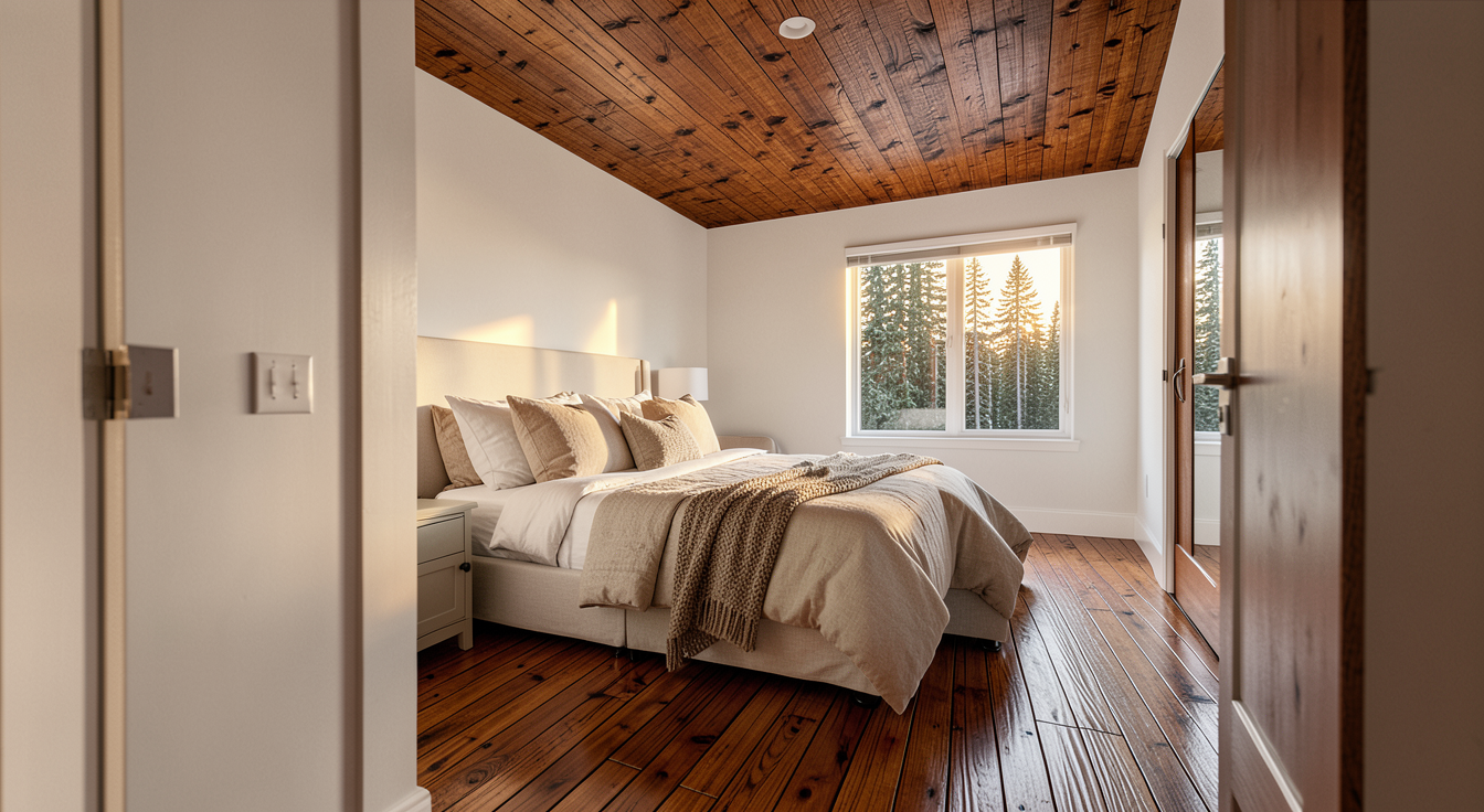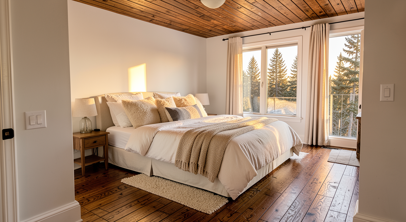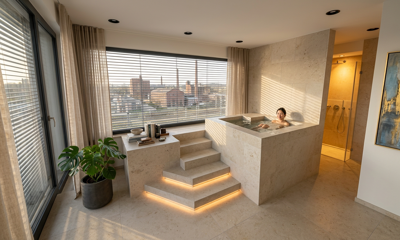 genau dieses rendering berarbeiten fotorealistisches innenraum foto exakt dieselbe perspektive und kameraposition wie das hochgeladene referenzbild 100 identische raumgeometrie im aussenbereich kleinst dtische industrieumgebung durch die fenster sichtbar rechts hinten ist die dusche auf der linken seite eine treppe mit indirekter beleuchtung der untersten zwei tritte vollfl chige horizontale jalousien ausserhalb der fenster beim fenster in front sind die jalousien komplett unten ganz rechts im bild ist die sauna hinter der verglasung alle beigen w nde und der beige boden ist homogener hellbeiger kalkstein visso montenegro platten 80x40 cm alle anderen w nde und die decke sind weissputz ral 9016 das fenster in front hat auf beiden seiten einen transparenten raumhohen beigen vorhang beim fenster auf der linken seite ebenfalls ein raumhoher vorhang rechts hinter der wanne ein modernes bild an der wand am boden steht vorne im bild auf der linken seite eine grosse moderne topfpflanze auf der linken seite hat es auf dem podest b cher und accessoires eine sehr h bsche asiatische frau um 25 sitzt im mit wasser gef llten tauchbecken raum zus tzlich k nstlich ausleuchten mit schwarzen runden deckenspots sanfte realistische schatten weiches nat rliches tageslicht mit schatten der jalousien an den w nden raum hinten rechts hell ausleuchten realistische materialien hochwertige oberfl chenreflexionen nat rliche farbwiedergabe golden hour feeling hell ausleuchten das bild muss wie eine professionelle fotografie aussehen es soll ein echtes und reales foto sein canon eos r5 35 mm festbrennweite f 2 8 hyperrealistisch dslr qualit t raw aufnahme 8k aufl sung extrem scharf perfekte tiefensch rfe professionelle architekturfotografie