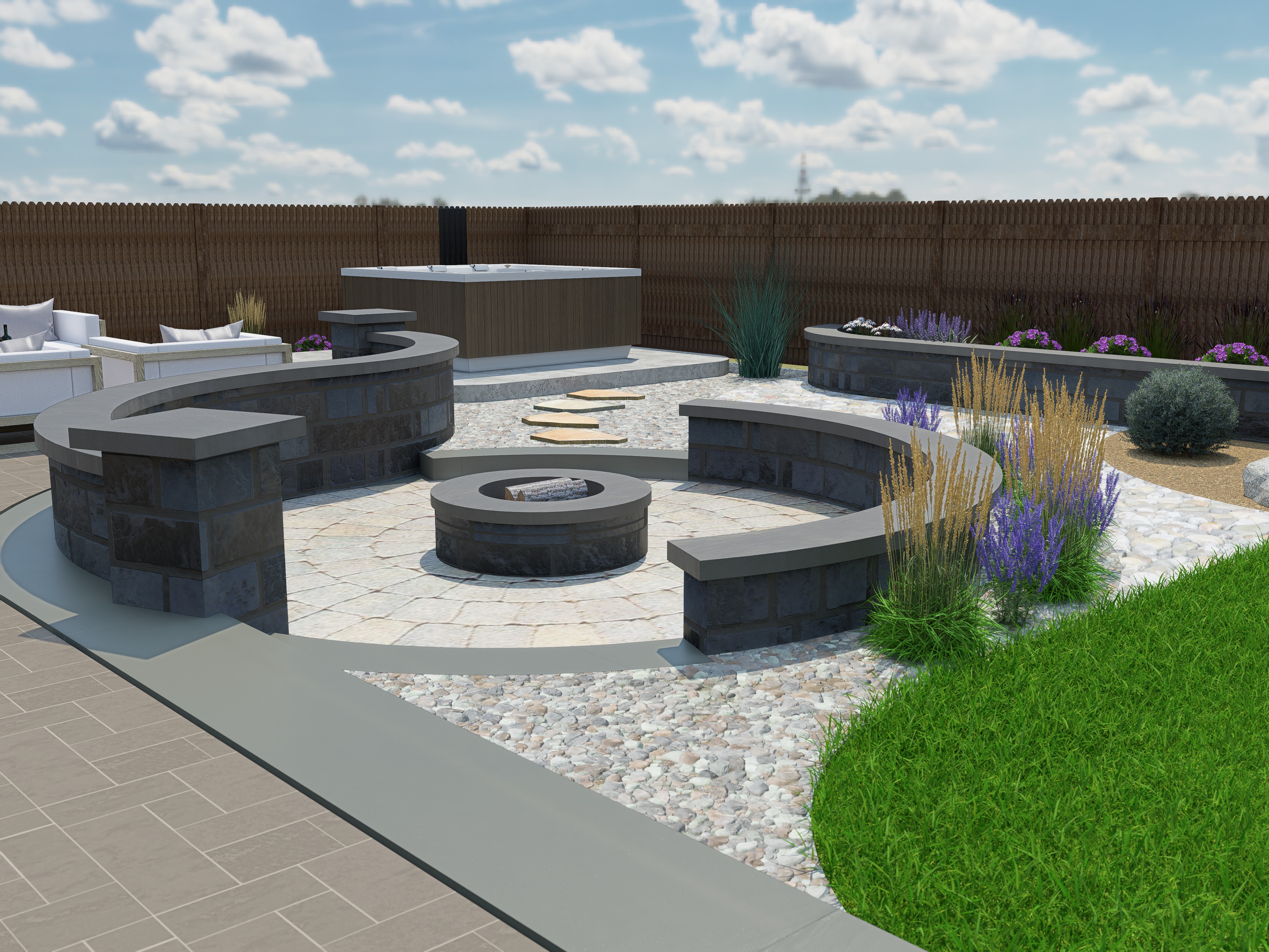hyper realistic architectural 3d visualization of a modern backyard patio with a circular stone fire pit and curved seating walls made of dark slate masonry the flooring features a mix of light colored flagstone pavers and white river rock gravel lush landscaping with purple lavender and ornamental grasses in the background a modern wood paneled hot tub and a dark privacy fence cinematic lighting during the golden hour soft shadows high quality textures on stone and wood 8k resolution photorealistic ray tracing unreal engine 5 style