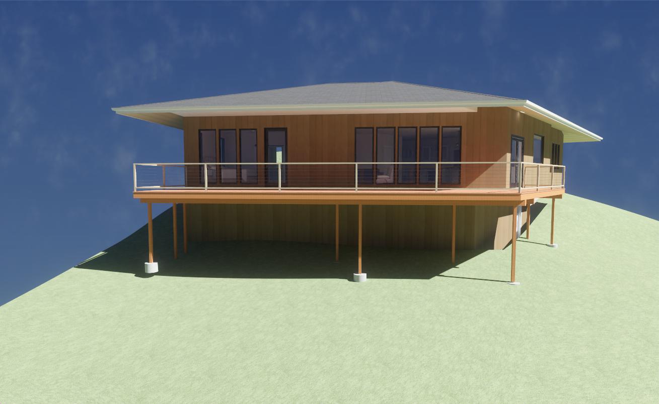 tongue and groove vertical cedar siding black gutters and soffits add down lights in the soffits trex deck with cedar posts and cable rail for deck railing asphalt shingle roofing landscape is a forested hillside with tall trees in the background